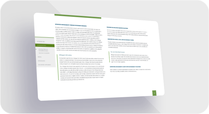 ADVANCING SUSTAINABILITY THROUGH INVESTMENT RESEARCH We produce robust ESG-focused investment research to meet investors’ needs for timely insights and analysis that support their sustainability and ESG investment strategies. In 2021, our Firm published over 900 ESG-related reports across key regions to address investors’ needs for strategic and thought-leading ESG analyses. Our published ESG content has included regular thematic thought pieces on key developments in ESG & Sustainability, collaborative pieces between ESG and Sector analysts that assessed ESG issues with industry context, and our ESGQ methodology, a proprietary scoring which combines data designed to capture the long-term corporate responsibility profiles of companies and their evolution over time with more frequently updated data points. In addition, in the “J.P. Morgan Perspectives” series, we published several departmental ESG collaborations, most notably focusing on the challenges posed by the energy crunch, the Net Zero transition, the cost of decarbonization and how climate innovation can accelerate the clean energy transition. Our Firm also facilitated dialogue between investors, companies and regulators on key ESG issues by hosting our 6th Global ESG Conference in 2021, which was attended by over 1,500 participants globally. To respond to the growing client need for ESG research, we expanded our capabilities in 2021, adding ESG specialists in both our Equity Research and Global Index Research groups across various geographies. JPMorgan’s ESG Indices First launched in April 2018, the J.P. Morgan ESG ("JESG") suite of fixed income indices consider ESG factors in the creation of a composite benchmark. The suite had more than $40 billion in assets across active and passively managed funds by 2021 year-end benchmarked against them. J.P. Morgan Index Research provides daily ESG scoring coverage for over 6,000 global corporate and quasi-sovereign issuers and over 170 sovereigns. The J.P. Morgan Index Research team expanded its JESG index suite in the fourth quarter of 2021 with the launch of the J.P. Morgan ESG Global Corporate Index ("JESG GCI") – an ESG benchmark covering investment grade and high yield markets across USD, EUR, and GBP currencies, as well as the launch of the J.P. Morgan Green Bond Index (GENIE) – an ESG-aligned benchmark tracking the $1 trillion green bond market, covering green bonds across hard currency (USD, EUR, and GBP) sovereign, quasi-sovereign, supranational, corporate and local currency green government bonds across 31 eligible currencies. In addition, the team launched carbon analytics for J.P. Morgan sovereign and corporate fixed income indices, and published inaugural carbon footprint reports for flagship benchmarks incorporating greenhouse gas emissions da ta. PROVIDING ESG-RELATED FINANCING SOLUTIONS The CIB's ESG Solutions team supports clients across our major industry verticals on their responses to ESG trends. In 2021, the ESG Solutions team helped enable clients’ access to ESG-focused capital across equity, debt and private markets and had a key role in several initial public offerings ("IPOs") leading the ESG work stream and assisting issuers during pre-IPO ESG ratings assessments. UNDERWRITING GREEN, SOCIAL AND SUSTAINABILITY BONDS Through our business, we are a lead underwriter of sustainable bonds (green, social and sustainability bonds) and sustainability-linked bond issuances. In 2021, JPMorgan Chase was the number one underwriter of sustainable bonds, and the Firm’s broker-dealer subsidiaries underwrote approximately $60 billion in green, social, sustainability and sustainability-linked bonds. Our 2021 Green Bond Issuance JPMorgan Chase issued a $1.25 billion green bond in August 2021. We allocated an amount equal to the net proceeds of that offering to support nine renewable energy investments in wind, solar and geothermal projects across the U.S. These projects are expected to produce approximately 7,000 gigawatt-hours of electricity annually, enough to supply approximately 650,000 homes with clean electricity each year. For more information, see page 73 in our ESG Report Appendices. SUPPORTING OUR MARKETS CLIENTS WITH SUSTAINABILITY SOLUTIONS Within CIB Markets, we created the Global Markets Sustainability Center ("GMSC") in October 2021 to further drive the Firm's efforts in providing sustainability solutions to institutional investors. 15 INTRODUCTION ENVIRONMENTAL Advancing Climate and Sustainability Solutions Operational Sustainability SOCIAL GOVERNANCE ESG REPORT APPENDICES