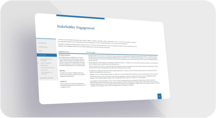 Stakeholder Engagement Our Firm has a range of stakeholders, including customers and clients, employees, communities, shareholders, regulators and policymakers, ESG raters, research analysts and suppliers. We engage with these stakeholders throughout the year to obtain insight into their needs and perspectives, as well as to share information about our Firm’s strategy, practices and performance. Responsibility for engaging with stakeholder groups is widely shared across our Firm’s lines of business and corporate functions, and we engage through numerous channels. The insight we gain from our engagement with key stakeholders feeds into the Firm’s business strategies, products and services and policies and procedures. Stakeholder Group How We Engage CUSTOMERS AND CLIENTS We are helping support our small business and consumer finance customers meet their financial needs, as well as our corporate and institutional clients. We regularly solicit and respond to customer and client feedback about our products, services and organization as a whole, and endeavor to build long-lasting relationships based on trust and mutual respect. • We engage regularly with our customers in our branches and through our website and social media platforms. We take pride in providing inclusive interaction. For example, we have multi- lingual staff in many of our branches and are investing in sign language interpreters at key locations – e.g., near Gallaudet University in Washington, D.C. We also seek customer feedback via online and in-branch surveys, with the aim of improving customer interaction and experience, and have a conduct hotline through which our customers can anonymously raise concerns and report misconduct. • We also engage with our clients through one-on-one meetings, roundtables and conferences – for example, the Firm’s Annual Health Care Conference, which aims to connect global industry leaders, emerging fast-growth companies and innovative technology creators. • We listen and respond to the needs of our customers and clients by offering products and services that emphasize social and environmental responsibility, including lending for affordable housing and electric vehicles and supporting minority-owned businesses through financial literacy coaching. EMPLOYEES Our people are at the heart of JPMorgan Chase and are vital to our success. We work to understand our employees’ evolving needs and perspectives. • We engage with our employees through surveys, including our global Employee Opinion Survey and Exit Surveys; town hall and small group meetings; focus groups; blogs, articles and newsletters; online feedback tools; and other forums. • Engagement surveys are conducted periodically and allow us to identify areas of strength and opportunities for improvement to promote continued employee satisfaction and retention. • Our CEO-led Town Halls cover topics such as business strategy and outlook, emerging industry trends and our progress on key Firm initiatives such as the $30 billion Racial Equity Commitment and $2.5 trillion Sustainable Development Target, and provide opportunities for employees to ask questions of our senior management. COMMUNITIES We are committed to ensuring the Firm's decisions are informed by diverse perspectives, particularly those of the communities we serve. • We are engaging with external stakeholders in a variety of forums. Through our longstanding Chase Advisory Panel program, we facilitate regular conversations among senior JPMorgan Chase executives and consumer policy groups, non-profit organizations, civic leaders, trade associations and diverse chambers of commerce, many of which are sources of information and ideas about how the Firm can promote racial equity through our products, services and approaches. In addition, in 2021 we created Community Engagement and National Stakeholder and Policy Engagement teams to further local engagement and two-way dialogue with stakeholders. 52 INTRODUCTION ENVIRONMENTAL SOCIAL GOVERNANCE Corporate Governance and ESG Oversight Stakeholder Engagement Risk Management Data Privacy and Cybersecurity Business Ethics Political Engagement and Public Policy ESG REPORT APPENDICES