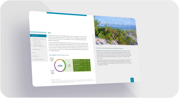 TOTAL $285B Green $106B Community Development $61B Development Finance $117B Eligibility Criteria $B % Sustainab le Transportation $22 4 21% Renewable En ergy & Energy Efficiency $14 14% Water & Waste Management $6 6% Green Buildings $2 2% Mixed Use 5 $60 57% Courtesy of Vineyard Wind LLC GREEN By the end of 2030, we aim to finance and facilitate $1 trillion in support of the deployment of solutions for cleaner sources of energy and facilitating the transition to a low-carbon economy. Our eligible business activities include renewable energy, clean technology, water, waste management, conservation, sustainable transportation, green buildings and energy efficiency. In 2021, we financed and facilitated approximately $106 billion in support of our green objective, particularly towards sustainable transportation and renewable energy. We supported these areas through a variety of businesses around our Firm, such as underwriting green bonds for corporate and sovereign issuers, capital raising and advisory services for electric vehicles ("EV") companies and lending to emerging renewable energy companies. 2021, in particular, was a year characterized by strong market factors, including record-breaking global M&A activity and significant growth of the sustainable bond market. Our Target in Action: Powering America’s Largest Offshore Wind Farm JPMorgan Chase served as Joint Lead Arranger for more than $2 billion in financing for the 800 megawatt Vineyard Wind project, the first offshore wind farm in the United States capable of generating power at utility scale and the country’s largest source of offshore wind power. Situated off the coast of Martha’s Vineyard, the project is expected to supply enough energy to serve the needs of 400,000 Massachusetts households and businesses and avoid 1.68 million metric tons of carbon emissions annually, while contributing to efforts to transition the U.S. power grid to cleaner sources of energy. JPMorgan Chase provided services across our diversified business to support the development of Vineyard Wind. We provided Investment Banking services, acting as Joint Lead Arranger and Syndication Agent for a senior secured loan. We also provided Markets products (providing hedges to mitigate risk) and Treasury products (cash management as the depository account bank). 6 4 Totals may not sum due to rounding. 5 Mixed Use is comprised of transactions where the use of proceeds may facilitate activities across more than one eligibility criteria, such as green bonds and emissions contracts. 6 Of the various products and services JPMorgan Chase provided to support the project, only the senior secured loan was counted towards the Target. For the senior secured loan which had multiple book runners, only JPMorgan Chase's participation is counted toward the Target. Select Eligibility Criteria by Dollar Amount 8 INTRODUCTION Message from Our Chairman & CEO Company at a Glance Our Approach to ESG Feature: Our $2.5 Trillion Sustainable Development Target ENVIRONMENTAL SOCIAL GOVERNANCE ESG REPORT APPENDICES
