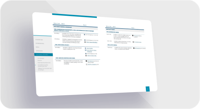 Metric Code Metric Source INVESTMENT BANKING & BROKERAGE TOPIC: INCORPORATION OF ENVIRONMENTAL, SOCIAL AND GOVERNANCE FACTORS IN INVESTMENT BANKING & BROKERAGE ACTIVITIES FN-IB-410a.2 (1) Number and (2) total value of investments and loans incorporating integration of environmental, social and governance (ESG) factors, by industry 2021 ESG Report (p. 12–16, 51, 54) FN-IB-410a.3 Description of approach to incorporation of environ - mental, social and governance (ESG) factors in investment banking and brokerage activities 2021 ESG Report (p. 12–16, 51, 54) Carbon Compass Methodology TOP IC: PROFESSIONAL INTEGRITY FN-IB-510b.4 Description of approach to ensuring professional integrity, including duty of care Code of Conduct Code of Ethics for Finance Pro fessionals 2021 ESG Report (p. 57–58) Conflict of Interest Policy TO PIC: EMPLOYEE INCENTIVES & RISK TAKING FN-IB-550b.3 Discussion of policies around supervision, control and validation of traders’ pricing of Level 3 assets and liabilities 2021 Form 10-K (p. 81–84, 149, Note 2 169–189) 2022 Proxy Statement (p . 39) Metric Code Metric Source MORTGAGE FINANCE TOPIC: DISCRIMINATORY LENDING FN-MF-270b.1 (1) Number, (2) value and (3) weighted average Loan- to-Value (LTV) ratio of mortgages issued to (a) minority and (b) all other borrowers, by FICO scores above and below 660 2021 Form 10-K (Note 12, p. 229–247) FN-MF-270b.3 Description of policies and procedures for ensuring nondiscriminatory mortgage origination Fair Lending Overview TOPIC: ACTIVITY METRICS FN-MF-000.A (1) Number and (2) value of mortgages originated by category: (a) residential and (b) commercial 2021 Form 10-K (p. 66, footnote e) 72 INTRODUCTION ENVIRONMENTAL SOCIAL GOVERNANCE ESG REPORT APPENDICES List of Acronyms Resources Global Reporting Initiative Index Sustainability Accounting Standards Board Index JPMorgan Chase Sustainable Bond Annual Report