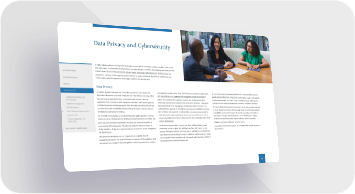 Data Privacy and Cybersecurity As digital solutions play an ever-larger role in financial services and the economy as a whole, the risk of cyber-attacks and other threats to information security continues to evolve and grow. In addition, the individuals with whom the Firm interacts expect that our data practices are safe and lawful. Data privacy and cybersecurity therefore remain top priorities for our Firm. At the same time, greater reliance on remote work due to the COVID-19 pandemic has only further underscored the importance of safe digital solutions and data practices. and remediation activities in the Firm. The Firm’s privacy framework outlines roles and responsibilities, sets compliance risk management controls in the form of policies and standards, directs advisory requests, and provides protocols for monitoring, reporting and escalation of key privacy risks and issues. The program reports periodically to our management, including our Board of Directors. Our multi-stakeholder approach to oversight and governance is embedded in our three lines of defense and supported by dedicated data and privacy teams around the world. We provide regular training and awareness to our workforce, not only on core privacy obligations and how to meet them, but also on emerging risks, trends and new developments. Information on how we collect, process, use, share and disposition personal information, as well as rights that individuals may have with respect to their personal information and how to exercise them, is available on our websites and upon request through multiple channels. In addition to traditional privacy notices, we often publish related materials such as frequently asked questions and tips for keeping personal financial information safe. We have a wide range of technological, administrative, organizational and physical security measures designed to safeguard the confidentiality, integrity and availability of personal information. Our Code of Conduct and related policies include specific guidelines on how employees should protect customers’ confidential information. We have established processes and procedures to report and respond to suspected or actual data privacy incidents that may compromise the confidentiality, integrity or availability of personal information. We provide our employees the ability to make reports through our internal systems. Our centralized process requires escalation to a dedicated incident response team for severity assessment, mitigation, root cause analysis and corrective action. In accordance with the Firm's policies, we notify individuals and our regulators of data incidents. Data Privacy As a global financial institution, our Firm collects, processes, uses, shares and dispositions all manner of personal information and financial data every day, and we have processes to manage that data in accordance with the laws, rules and regulations of the countries in which we operate. We take a multi-faceted approach to addressing privacy and data protection risks, including maintaining and evolving our internal controls, establishing policies covering all stages of the data lifecycle and deploying appropriate technology. Our Firmwide internal policy on personal information applies globally to our legal entities as well as third parties that handle personal information on our behalf. The policy sets forth minimum requirements including that personal information is processed for defined purposes. The policy also specifies the use of privacy by design principles, designed to ensure that privacy is taken into account throughout the data lifecycle. Data protection and privacy are key components of our global data risk management program. That program focuses on execution of the compliance and operational risk oversight of data management and privacy governance, controls 55 INTRODUCTION ENVIRONMENTAL SOCIAL GOVERNANCE Corporate Governance and ESG Oversight Stakeholder Engagement Risk Management Data Privacy and Cybersecurity Business Ethics Political Engagement and Public Policy ESG REPORT APPENDICES