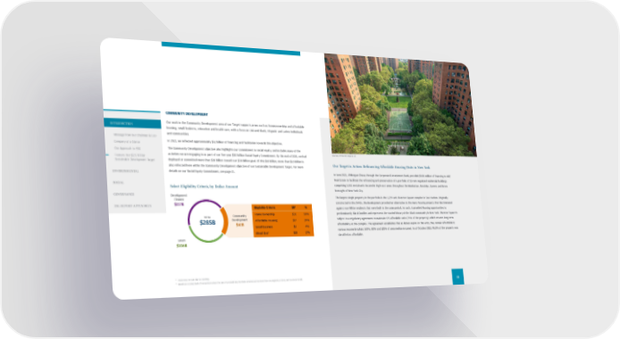 Courtesy of Riverton Square LLC TOTAL $285B Green $106B Development Finance $117B Community Development $61B Eligibility Criteria $B 8 % Home Ownership $31 50% Affordable Housing $17 29% Small Business $2 4% Mixed Use 9 $10 17% COMMUNITY DEVELOPMENT Our work in the Community Development area of our Target supports areas such as homeownership and affordable housing, small business, education and health care, with a focus on LMI and Black, Hispanic and Latino individuals and communities. In 2021, we reflected approximately $61 billion of financing and facilitation towards this objective. The Community Development objective also highlights our commitment to racial equity, and includes many of the activities we are engaging in as part of our five-year $30 billion Racial Equity Commitment. By the end of 2021, we had deployed or committed more than $18 billion toward our $30 billion goal. Of this $18 billion, more than $16 billion is also reflected here within the Community Development objective of our Sustainable Development Target. For more details on our Racial Equity Commitment, see page 21. Our Target in Action: Refinancing Affordable Housing Units in New York In June 2021, JPMorgan Chase, through the Corporate & Investment Bank, provided $600 million of financing to A&E Real Estate to facilitate the refinancing and preservation of a portfolio of 53 rent-regulated residential buildings comprising 3,531 rental units located in high-cost areas throughout the Manhattan, Brooklyn, Queens and Bronx boroughs of New York City. The largest single property in the portfolio is the 1,229-unit Riverton Square complex in East Harlem. Originally constructed in the 1940s, the development provided an alternative to the many housing projects that discriminated against non-White residents that were built in the same period. As such, it provided housing opportunities to predominantly Black families and represents the storied history of the Black community in New York. Riverton Square is subject to a regulatory agreement to maintain 975 affordable units (79% of the property), which ensures long term affordability at the complex. The agreement establishes that as leases expire on the units, they remain affordable to various income brackets (60%, 80% and 125% of area median income). As of October 2021, 96.5% of the property was classified as affordable. 8 Totals may not sum due to rounding. 9 Mixed Use is comprised of transactions where the use of proceeds may facilitate activities across more than one eligibility criteria, such as social bonds. Select Eligibility Criteria by Dollar Amount 10 INTRODUCTION Message from Our Chairman & CEO Company at a Glance Our Approach to ESG Feature: Our $2.5 Trillion Sustainable Development Target ENVIRONMENTAL SOCIAL GOVERNANCE ESG REPORT APPENDICES