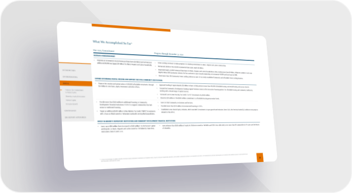 What We Accomplished So Far 11 11 A note on terminology: All updates related to the Racial Equity Commitment noted below are focused on Black, Hispanic and Latino households, customers, clients and/or communities and that is not restated for each metric. The homeownership and small business goals are incremental units and dollars above an annual baseline that is benchmarked to 2019 business results. Our 2025 Commitment Progress through December 31, 2021 INCREASE HOMEOWNERSHIP • Originate an incremental 40,000 home purchase loans ($8 billion) and refinance an additional 20,000 mortgages ($4 billion) for Black, Hispanic and Latino households. • Home Lending continues to make progress in its lending commitment to Black, Hispanic and Latino communities. • Refinanced 19,000 of the 20,000 incremental loans goal, nearly $5 billion. • Originated nearly 12,000 home purchase loans for Black, Hispanic and Latino households in 2021, totaling more than $4 billion. While the number of units was slightly below 2019 production volume, the firm continues to pace towards originating an incremental 40,000 purchase loans by 2025. • Hired more than 150 Community Home Lending Advisors as part of our newly-established Community and Affordable Home Lending business. EXPAND AFFORDABLE RENTAL HOUSING AND SUPPORT FOR VITAL COMMUNITY INSTITUTIONS • Finance the creation and preservation of 100,000 affordable rental units through $14 billion in new loans, equity investment and other efforts. • Approved funding of approximately $13 billion in loans to help preserve more than 100,000 affordable housing and rental housing units across the U.S. • Created the Community Development Banking Capital Solutions team to offer innovative financing options for affordable housing and community facilities by working with a broad range of capital sources. • Increased Low-Income Housing Tax Credit ("LIHTC") investments by $400 million. • Closed on $76 million of the $500 million commitment to affordable housing preservation funds. • Provide more than $300 million in additional financing to Community Development Financial Institutions ("CDFIs") to support communities that lack access to traditional financing. • Target an additional $100 million in New Markets Tax Credit ("NMTC") investments with a focus on Black-owned or -led projects primarily serving Black populations. • Invest in Vital Community Institutions and Services. • Provided more than $190 million in incremental financing to CDFIs. • Established a new Racial Equity Initiative, which uses NMTC investments to spur growth and inclusion. Since 2020, the Firm has funded $221 million in new projects related to that effort. INVEST IN MINORITY DEPOSITORY INSTITUTIONS AND COMMUNITY DEVELOPMENT FINANCIAL INSTITUTIONS • Invest up to $50 million (later increased to $100 million) –in the form of capital and deposits to Black, Hispanic and Latino-owned or -led Minority Depository Institutions ("MDIs") and CDFIs. • Invested more than $100 million of equity in 15 diverse-owned or -led MDIs and CDFIs that collectively serve more than 89 communities in 19 states and the District of Columbia. 22 INTRODUCTION ENVIRONMENTAL SOCIAL Feature: Our Commitment to Racial Equity Diversity, Equity & Inclusion Human Capital Inclusive Growth GOVERNANCE ESG REPORT APPENDICES
