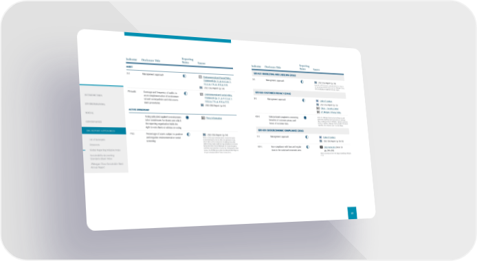 Indicator Disclosure Title Reporti ng Status Source AUDIT 3-3 Management approach Environmental and Social Policy Framework (p. 3 I, p. 4 II.D, p. 5 II.E.2, p. 7 III, p. 8 IV, p. 9 V) 2021 ESG Report (p. 54) FS -Audit Coverage and frequency of audits to assess implementation of environmen - tal and social policies and risk assess - ment procedures Environmental and Social Policy Framework (p. 3 I, p. 4 II.D, p. 5 II.E.2, p. 7 III, p. 8 IV, p. 9 V) 2021 ESG Report (p. 54) AC TIVE OWNERSHIP Voting policy(ies) applied to environmen - tal or social issues for shares over which the reporting organization holds the right to vote shares or advises on voting Proxy Information FS11 Percentage of assets subject to positive and negative environmental or social screening 2021 ESG Report (p. 54) Note: In 2021, approximately 9,464 transactions were screened using the internal E&S risk submission form, which led to 2,540 transactions (including loans, debt underwriting, equity underwriting and advisory services) being referred to the GESRM team for review because a potential environmental or social risk. Following the initial review, the GESRM team undertook detailed due diligence of approximately 1,938 of these transactions. Indicator Disclosure Title Repor ting Status Source GRI 417: MARKETING AND LABELING (2016) 3-3 Management approach 2021 ESG Report (p. 58) Note: Fair and transparent communications is an import- ant marketing communications topic for JPMorgan Chase, which we discuss on page 58 of our ESG report. GRI 418: CUSTOMER PRIVACY (2016) 3-3 Management approach Code of Conduct 2021 ESG Report (p. 55) Chase — Security Center J.P. Morgan—Privacy Policy 418 -1 Substantiated complaints concerning breaches of customer privacy and losses of customer data Note: It is JPMorgan Chase’s policy to follow U.S. and global laws regarding reporting breaches of customer data, including notices to individuals, regulators and other entities. In addition, JPMorgan Chase provides information regarding risks related to cyber in its SEC filings. GRI 419: SOCIOECONOMIC COMPLIANCE (2016) 3-3 Management approach Code of Conduct 2021 ESG Report (p. 50–51) 419 -1 Non-compliance with laws and regula - tions in the social and economic area 2021 Form 10-K (Note 30 pp. 290–293) Refer to the note on the Firm’s legal proceedings (indicator 2–27). 69 INTRODUCTION ENVIRONMENTAL SOCIAL GOVERNANCE ESG REPORT APPENDICES List of Acronyms Resources Global Reporting Initiative Index Sustainability Accounting Standards Board Index JPMorgan Chase Sustainable Bond Annual Report