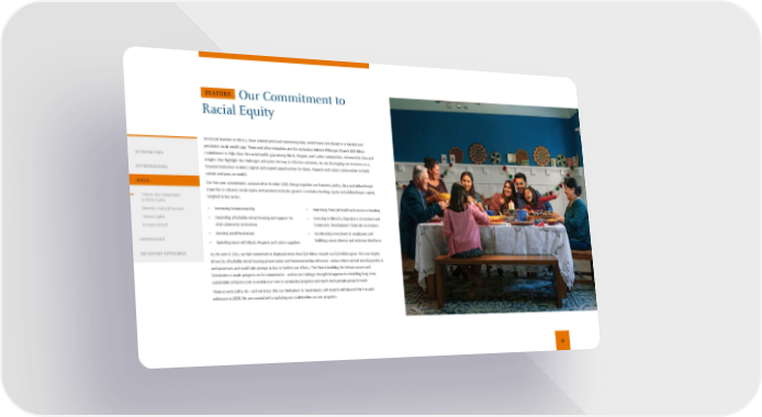 Our Commitment to Racial Equity • Increasing homeownership • Expanding affordable rental housing and support for vit al community institutions • Growing small businesses • Spending more with Black, Hispanic and Latino suppliers • Improving financial health and access to banking • Investing in Minority Depository Institutions and Community Development Financial Institutions • Accelerating investment in employees and building a more diverse and inclusive Workforce By the end of 2021, we had committed or deployed more than $18 billion toward our $30 billion goal. This was largely driven by affordable rental housing preservation and homeownership refinance – areas where we had existing products and processes and could take prompt action to further our efforts. The Firm is building the infrastructure and foundation to make progress on its commitment – and we are taking a thoughtful approach to building long-term, sustainable infrastructure to enable our Firm to accelerate progress and reach more people going forward. There is work still to do – and we know that our dedication to racial equity will extend well beyond the five-year milestone in 2025. We are committed to updating our stakeholders on our progress. FEATURE Structural barriers in the U.S. have created profound racial inequities, which have contributed to a marked and persistent racial wealth gap. These and other inequities are the motivation behind JPMorgan Chase’s $30 billion commitment to help close the racial wealth gap among Black, Hispanic and Latino communities. Informed by data and insights that highlight the challenges and point the way to effective solutions, we are leveraging our resources as a financial institution to direct capital and expand opportunities for Black, Hispanic and Latino communities to build, sustain and pass on wealth. Our five-year commitment, announced in October 2020, brings together our business, policy, data and philanthropic expertise to advance racial equity and promote inclusive growth. It includes lending, equity and philanthropic capital, targeted in key areas: 21 INTRODUCTION ENVIRONMENTAL SOCIAL Feature: Our Commitment to Racial Equity Diversity, Equity & Inclusion Human Capital Inclusive Growth GOVERNANCE ESG REPORT APPENDICES