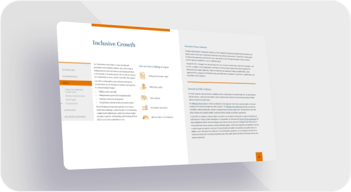 Inclusive Growth Our Firm believes that business, in partnership with government and community leaders, has a role to play in helping everyone have the chance to participate and share in the rewards of economic growth. We are only as strong as the communities we serve, and the economies they support. Our efforts to help build a more inclusive economy are focused where we can leverage our business and expertise to create meaningful impact: • Building careers and skills • Fueling business growth and entrepreneurship • Catalyzing community development • Strengthening financial health and wealth creation We are bringing the reach and expertise of our Firm to tackle these challenges, using the power of our businesses, combined with philanthropic capital, data-driven insights and policy expertise. Underpinning and informing all these efforts is our Firm’s commitment to DEI. How our Firm is Making an Impact Lending and investment capital Philanthropic capital Policy expertise Data insights and analytics Innovative Finance Solutions Through a dedicated pool of proprietary capital, our Firm is helping fill the gap between philanthropic and market-rate capital to lend to and invest in organizations and projects that advance inclusive growth. These efforts include support for diverse-led organizations and those that serve communities of color. This approach helps our Firm to reinvest returned capital in communities to attract additional capital. Through this effort, JPMorgan Chase provides long-term, low-cost loans to mission-driven financial intermediaries, such as CDFIs. In addition, we are making equity investments in funds and early-stage, mission-driven companies that advance the Firm’s impact objectives. In 2021, we closed 13 such transactions totaling over $100 million, which supported efforts ranging from affordable housing and small business development to platforms to upskill workers and help college students graduate. Skills and talents of our employees Research and Policy Solutions Our Firm’s expertise, data and research capabilities make us well positioned to provide insight into consumer behavior and the economy – and we put that insight to work to advance policy solutions that drive inclusive growth and help advance racial and economic equity. The JPMorgan Chase Institute is a think tank dedicated to leveraging the Firm’s data to produce insights on the inner workings of the economy and important policy questions. The JPMorgan Chase Policy Center develops and advances sustainable, evidence-based policy solutions to expand inclusive economic opportunity. The Policy Center works with policy, business and community leaders to advance effective solutions at all levels of government. In early 2021, for example, as decision-makers continued to assess policies and programs to support households and small businesses facing economic hardship due to the pandemic, our Firm released T he First 100 Days and Beyond . The report highlighted research from the JPMorgan Chase Institute and the work of the JPMorgan Chase Policy Center to inform data-driven recovery policies to provide immediate support to those most impacted by the pandemic in the U.S., as well as longer-term policies to increase the financial health and stability of households and small businesses. In addition, as the Firm advances the objectives of our Racial Equity Commitment, we are drawing on the work of the Institute and Policy Center to develop and promote data-driven public policies that bolster an inclusive recovery and advance racial equity. 36 INTRODUCTION ENVIRONMENTAL SOCIAL Feature: Our Commitment to Racial Equity Diversity, Equity & Inclusion Human Capital Inclusive Growth GOVERNANCE ESG REPORT APPENDICES