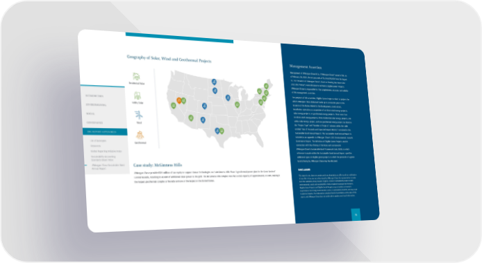 Management Assertion Management of JPMorgan Chase & Co. (“JPMorgan Chase”) asserts that, as of February 28, 2022, the net proceeds of $1,246,875,000 from the August 10, 2021 issuance of JPMorgan Chase’s Fixed-to-Floating Rate Notes due 2025 (the “Notes”) were allocated to refinance Eligible Green Projects. JPMorgan Chase is responsible for the completeness, accuracy and validity of this management assertion. For purposes of this assertion, Eligible Green Projects relate to projects for which JPMorgan Chase disbursed funds up to 24 months prior to the issuance of the Notes related to the development, construction, installation, operation, or acquisition of on-shore wind energy projects, solar energy projects, or geothermal energy projects. There were four on-shore wind energy projects, three residential solar energy projects, one utility solar energy project, and one geothermal energy project (as listed in the “Project Type” and “Number of Projects” columns within the table entitled “Use of Proceeds and Expected Impact Metrics” contained in this Sustainable Bond Annual Report). This Sustainable Bond Annual Report is included as an appendix to JPMorgan Chase’s 2021 Environmental, Social & Governance Report. The definition of Eligible Green Projects used in connection with the offering of the Notes and contained in JPMorgan Chase’s Sustainable Bond Framework (July 2020), to which reference is made within this Sustainable Bond Annual Report, specifies additional types of eligible green projects to which the proceeds of a green bond offering by JPMorgan Chase may be allocated. DISCLAIMER This report is not, does not contain and is not intended as an offer to sell or a solicitation of any offer to buy any securities issued by JPMorgan Chase. No representation is made as to the suitability of any issuance of green, social or sustainability bonds to fulfill environmental, social and sustainability criteria required by prospective investors. Eligible Green Projects and Eligible Social Projects may not satisfy an investor’s expectations concerning environmental, social or sustainability benefits, and may result in adverse impacts. The information contained herein is provided as of the date of this report, and JPMorgan Chase does not undertake to update any of such information. Wind Residential Solar Geothermal Utility Solar Case study: McGinness Hills JPMorgan Chase provided $59 million of tax equity to support Ormat Technologies Inc.’s McGinness Hills Phase 3 geothermal power plant in the Great Basin of Central Nevada, resulting in 48 MW of additional clean power to the grid. The McGinness Hills complex now has a total capacity of approximately 160 MW, making it the largest geothermal complex in Nevada and one of the largest in the United States. Geography of Solar, Wind and Geothermal Projects 74 INTRODUCTION ENVIRONMENTAL SOCIAL GOVERNANCE ESG REPORT APPENDICES List of Acronyms Resources Global Reporting Initiative Index Sustainability Accounting Standards Board Index JPMorgan Chase Sustainable Bond Annual Report
