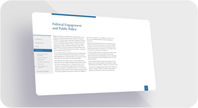Political Engagement and Public Policy JPMorgan Chase believes that responsible corporate citizenship demands a strong commitment to a healthy and informed democracy through civic and community involvement. Our business is subject to extensive laws and regulations, and changes to such laws can significantly affect how we operate, our revenues and the costs we incur. Because of the impact public policy can have on our businesses, employees, communities and customers, we engage with policymakers on a range of issues – including banking, financial services, cybersecurity, workforce development, small business, tax, trade and inclusive economic growth, among others – to advance and protect the long-term interests of the Firm. The Firm’s political engagement and public policy activities are managed by Global Government Relations. This organization and leadership helps us focus the Firm’s political engagement efforts on those public policy issues most relevant to the long- term interests of the Firm overall and to our clients and shareholders. Another important way we advocate for policy is through the JPMorgan Chase Policy Center, which works to publish sustainable, evidence-based policy solutions to drive inclusive economic growth in the U.S. and around the world. In 2021, we continued our focus on federal and state policy changes to remove barriers to employment for people with criminal backgrounds, as part of our Second Chance Agenda. We also focused on policies to enhance racial equity, expand opportunities for underserved communities and continue the economic recovery following the onset of the COVID-19 pandemic, such as expanding the Earned Income Tax and Child Tax Credits, modernizing unemployment insurance and increasing the minimum wage. We belong to several trade associations that advocate on major public policy issues of importance to the Firm and the communities we serve. The Firm’s participation as a member of these associations comes with the understanding that we may not always agree with all the positions of an association or its other members, and that we are committed to voicing our concerns as appropriate. The Public Responsibility Committee of our Board of Directors provides oversight of our positions and practices on public responsibility matters, including significant policies and practices regarding political contributions, major lobbying priorities and principal trade association memberships that relate to the Firm's public policy objectives. We aim to operate with the highest standards of public transparency in political spending. Our efforts have been recognized by the CPA-Zicklin Index of Corporate Political Disclosure and Accountability as a "Trendsetter" with an overall score of 97.14%. The Firm discloses on its website contributions made by the Firm's political action committees, contributions of corporate funds made in connection with ballot initiatives and information about our governance and oversight practices. 59 INTRODUCTION ENVIRONMENTAL SOCIAL GOVERNANCE Corporate Governance and ESG Oversight Stakeholder Engagement Risk Management Data Privacy and Cybersecurity Business Ethics Political Engagement and Public Policy ESG REPORT APPENDICES