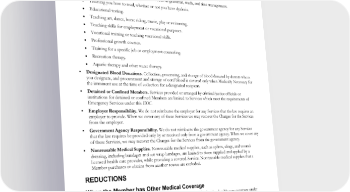• Teaching manners and etiquette. • Teaching and support services to develop planning skills such as daily activity planning and project or task planning. • Items and services that increase academic knowledge or skills. • Teaching and support services to increase intelligence. • Academic coaching or tutoring for skills such as grammar, math, and time management. • Teaching you how to read, whether or not you have dyslexia. • Educational testing. • Teaching art, dance, horse riding, music, play or swimming. • Teaching skills for employment or vocational purposes. • Vocational training or teaching vocational skills. • Professional growth courses. • Training for a specific job or employment counseling. • Recreation therapy. • Aquatic therapy and other water therapy. Designated Blood Donations. Collection, processing, and storage of blood donated by donors whom you designate, and procurement and storage of cord blood is covered only when Medically Necessary for the imminent use at the time of collection for a designated recipient. Detained or Confined Members. Services provided or arranged by criminal justice officials or institutions for detained or confined Members are limited to Services which meet the requirements of Emergency Services under this EOC. Employer Responsibility. We do not reimburse the employer for any Services that the law requires an employer to provide. When we cover any of these Services we may recover the Charges for the Services from the employer. Government Agency Responsibility. We do not reimburse the government agency for any Services that the law requires be provided only by or received only from a government agency. When we cover any of these Services, we may recover the Charges for the Services from the government agency. Nonreusable Medical Supplies. Nonreusable medical supplies, such as splints, slings, and wound dressing, including bandages and ace wrap bandages, are limited to those supplied and applied by a licensed health care provider, while providing a covered Service. Nonreusable medical supplies that a Member purchases or obtains from another source are excluded. REDUCTIONS When the Member has Other Medical Coverage This Coordination of Benefits (COB) provision applies when the Member has health care coverage under more than one Plan. To avoid delays in claim processing, you and your provider should file all claims with each Plan at the same time. If Medicare is your Primary Plan, Medicare may submit your claims to your Secondary Plan for you. The order of benefit determination rules described under this “When the Member has other Medical Coverage” section determines the order in which each Plan will pay a claim for benefits. The Plan that pays EWCLGHDHP1983ACT0124 76 WAPEBB-CD-ACT