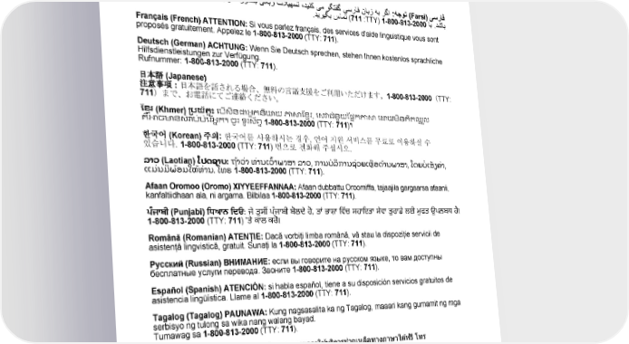 አማርኛ (Amharic) ማስታወሻ: የሚናገሩት ቋንቋ ኣማርኛ ከሆነ የትርጉም እርዳታ ድርጅቶች፣ በነጻ ሊያግዝዎት ተዘጋጀተዋል፡ ወደ 1-800-813-2000 (TTY: 711). ሚከተለው ቁጥር ይደውሉ مﻗرﺑ لﺻﺗا .نﺎﺟﻣﻟﺎﺑ كﻟ رﻓاوﺗﺗ ﺔﯾوﻐﻠﻟا ةدﻋﺎﺳﻣﻟا تﺎﻣدﺧ نﺈﻓ ،ﺔﯾﺑرﻌﻟا ثدﺣﺗﺗ تﻧﻛ اذإ :ﺔظوﺣﻠﻣ (Arabic) ﺔﯾﺑرﻌﻟا .(711 :TTY) 1-800-813-2000 中文 (Chinese) 注意:如果您使用繁體中文,您可以免費獲得語言援助服務。請致電1-800-813- 2000(TTY:711)。 ﯽﻣ مھارﻓ ﺎﻣﺷ یارﺑ نﺎﮕﯾار تروﺻﺑ ﯽﻧﺎﺑز تﻼﯾﮭﺳﺗ ،دﯾﻧﮐ ﯽﻣ وﮕﺗﻔﮔ ﯽﺳرﺎﻓ نﺎﺑز ﮫﺑ رﮔا :ﮫﺟوﺗ (Farsi) ﯽﺳرﺎﻓ .دﯾرﯾﮕﺑ سﺎﻣﺗ (711 :TTY) 1-800-813-2000 ﺎﺑ .دﺷﺎﺑ Français (French) ATTENTION: Si vous parlez français, des services d'aide linguistique vous sont proposés gratuitement. Appelez le 1-800-813-2000 (TTY: 711). Deutsch (German) ACHTUNG: Wenn Sie Deutsch sprechen, stehen Ihnen kostenlos sprachliche Hilfsdienstleistungen zur Verfügung. Rufnummer: 1-800-813-2000 (TTY: 711). 日本語 (Japanese) 注意事項:日本語を話される場合、無料の言語支援をご利用いただけます。1-800-813-2000(TTY: 711)まで、お電話にてご連絡ください。 ែខ�រ (Khmer) ្របយ័ត�៖ េបើសន�ិ អ�កនិ�យ ��ែខ�រ, េស�ជំនួយែផ�ក�� េ�យមិនគិតឈ� ល� គឺ�ច�នសំ�បប់ ំេរអ� �ក។ ចូរ ទូរសព័ � 1-800-813-2000 (TTY: 711)។ 한국어 (Korean) 주의: 한국어를 사용하시는 경우, 언어 지원 서비스를 무료로 이용하실 수 있습니다. 1-800-813-2000 (TTY: 711) 번으로 전화해 주십시오. ້ ່ ລາວ (Laotian) ໂປດຊາບ: ຖ້າວ່າ ທ່ານເວົ າພາສາ ລາວ, ການບໍ ລິ ການຊ່ວຍເຫືຼ ອດ້ານພາສາ, ໂດຍບໍ ເສັ ຽຄ່າ, ແມ່ນມີ ພ້ອມໃຫ້ທ່ານ. ໂທຣ 1-800-813-2000 (TTY: 711). Afaan Oromoo (Oromo) XIYYEEFFANNAA: Afaan dubbattu Oroomiffa, tajaajila gargaarsa afaanii, kanfaltiidhaan ala, ni argama. Bilbilaa 1-800-813-2000 (TTY: 711). ਪੰ ਜ ਾ ਬ ੀ (Punjabi) ਿਧਆਨ ਿਦਓ: ਜੇ ਤੁਸ� ਪੰਜਾਬੀ ਬੋਲਦੇ ਹੋ, ਤ� ਭਾਸ਼ਾ ਿਵੱਚ ਸਹਾਇਤਾ ਸੇਵਾ ਤੁਹਾਡੇ ਲਈ ਮੁਫਤ ਉਪਲਬਧ ਹੈ। 1-800-813-2000 (TTY: 711) 'ਤੇ ਕਾਲ ਕਰੋ। Română (Romanian) ATENȚIE: Dacă vorbiți limba română, vă stau la dispoziție servicii de asistență lingvistică, gratuit. Sunați la 1-800-813-2000 (TTY: 711). Pусский (Russian) ВНИМАНИЕ: если вы говорите на русском языке, то вам доступны бесплатные услуги перевода. Звоните 1-800-813-2000 (TTY: 711). Español (Spanish) ATENCIÓN: si habla español, tiene a su disposición servicios gratuitos de asistencia lingüística. Llame al 1-800-813-2000 (TTY: 711). Tagalog (Tagalog) PAUNAWA: Kung nagsasalita ka ng Tagalog, maaari kang gumamit ng mga serbisyo ng tulong sa wika nang walang bayad. Tumawag sa 1-800-813-2000 (TTY: 711). ้ ่ ไทย (Thai) เรียน: ถา้ คณุ พดภู าษาไทย คณุ สามารถใชบรกิ ารชวยเหลอื ทางภาษาไดฟร้ ี โทร 1-800-813-2000 (TTY: 711). Українська (Ukrainian) УВАГА! Якщо ви розмовляєте українською мовою, ви можете звернутися до безкоштовної служби мовної підтримки. Телефонуйте за номером 1-800-813-2000 (TTY: 711). Tiếng Việt (Vietnamese) CHÚ Ý: Nếu bạn nói Tiếng Việt, có các dịch vụ hỗ trợ ngôn ngữ miễn phí dành cho bạn. Gọi số 1-800-813-2000 (TTY: 711). EWCLGHDHP1983ACT0124 98 WAPEBB-CD-ACT