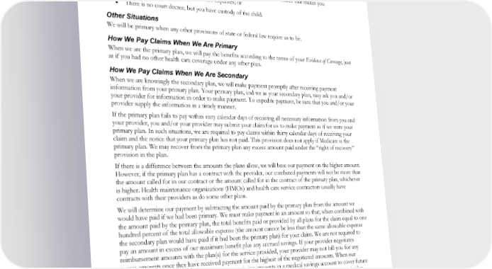 Your Child’s Expenses. The claim is for the health care expenses of your child who is covered by this plan; and • You are married, and your birthday is earlier in the year than your spouse’s or you are living with another individual, regardless of whether or not you have ever been married to that individual, and your birthday is earlier than that other individual’s birthday. This is known as the “birthday rule”; or • You are separated or divorced, and you have informed us of a court decree that makes you responsible for the child’s health care expenses; or • There is no court decree, but you have custody of the child. Other Situations We will be primary when any other provisions of state or federal law require us to be. How We Pay Claims When We Are Primary When we are the primary plan, we will pay the benefits according to the terms of your Evidence of Coverage, just as if you had no other health care coverage under any other plan. How We Pay Claims When We Are Secondary When we are knowingly the secondary plan, we will make payment promptly after receiving payment your information from primary plan. Your primary plan, and we as your secondary plan, may ask you and/or your provider for information in order to make payment. To expedite payment, be sure that you and/or your provider supply the information in a timely manner. If the primary plan fails to pay within sixty calendar days of receiving all necessary information from you and your provider, you and/or your provider may submit your claim for us to make payment as if we were your primary plan. In such situations, we are required to pay claims within thirty calendar days of receiving your claim and the notice that your primary plan has not paid. This provision does not apply if Medicare is the y primary plan. We may recover from the primary plan any excess amount paid under the “right of recover ” provision in the plan. If there is a difference between the amounts the plans allow, we will base our payment on the higher amount. However, if the primary plan has a contract with the provider, our combined payments will not be more than the amount called for in our contract or the amount called for in the contract of the primary plan, whichever is higher. Health maintenance organizations (HMOs) and health care service contractors usually have contracts with their providers as do some other plans. We will determine our payment by subtracting the amount paid by the primary plan from the amount we would have paid if we had been primary. We must make payment in an amount so that, when combined with the amount paid by the primary plan, the total benefits paid or provided by all plans for the claim equal to one hundred percent of the total allowable expense (the amount cannot be less than the same allowable expense the secondary plan would have paid if it had been the primary plan) for your claim. We are not required to pay an amount in excess of our maximum benefit plus any accrued savings. If your provider negotiates reimbursement amounts with the plan(s) for the service provided, your provider may not bill you for any excess amounts once they have received payment for the highest of the negotiated amounts. When our deductible is fully credited, we will place any remaining amounts in a medical savings account to cover future medical claims which might not otherwise have been paid. For example, if the primary plan covers similar kinds of health care expenses, but allows expenses that we do not cover, we may pay for those expenses. Questions about coordination of benefits? Contact your state insurance department. EWCLGHDHP1983ACT0124 96 WAPEBB-CD-ACT