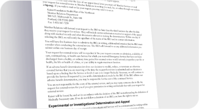 External review is permitted to occur simultaneously with your urgent pre-Service appeal or urgent concurrent care appeal; Your request qualifies for expedited external review; We have failed to comply with federal requirements regarding our claims and appeals procedures; or We have failed to comply with the Washington requirement to make a decision regarding the appeal within 30 calendar days for non-urgent appeals and 72 hours for urgent appeals. Within 180 calendar days after the date of our appeal denial letter you must call Member Services or send your request for external review to Member Relations in writing (via mail, fax, or online through our website at kp.org). If you wish to mail or fax your request, you may send it to us at: Kaiser Foundation Health Plan of the Northwest Member Relations Department 500 N.E. Multnomah St., Suite 100 Portland, OR 97232-2099 Fax: 1-855-347-7239 Member Relations will forward your request to the IRO no later than the third business day after the date they receive your request for review. They will include written information received in support of the appeal along with medical records and other documents relevant in making the determination. Within one day of selecting the IRO, we will notify the appellant of the name of the IRO and its contact information. You will have five business days to submit to the IRO, in writing, additional information that the IRO must consider when conducting the external review. The IRO will forward to us any additional information you submit within one business day of receipt. Your request for external review will be expedited if the your request concerns an admission, availability of care, continued stay, or health care Service for which you received Emergency Services but have not been discharged from a facility, or ordinary time period for external review would seriously jeopardize your life or health, the life or health of a fetus, or your ability to regain maximum function. If an adverse benefit determination involves our decision to modify, reduce, or terminate an otherwise covered Service that you are receiving at the time the request for review is submitted and our decision is based upon a finding that the Service or level of care is no longer Medically Necessary, we will continue to provide the Service if requested by you until a determination is made by the IRO. If the IRO affirms our adverse benefit determination, you may be responsible for the cost of the continued Service. You are not responsible for the costs of the external review, and you may name someone else to file the request for external review for you if you give permission in writing and include that with your request for external review. Kaiser will be bound by and act in accordance with the decision of the IRO notwithstanding the definition of Medically Necessary care. If we do not follow a decision of an IRO, you have the right to sue us. Experimental or Investigational Determination and Appeal Decisions on appeals about experimental or investigational Services will be communicated in writing within 20 days of receipt of a fully documented request, unless you consent in writing to an extension of time. Appeals that meet the criteria for an urgent appeal, as described in the “Urgent Pre-Service Appeal” section, will be expedited to meet the clinical urgency of the situation, not to exceed 72 hours. If, on appeal, the decision to deny Services is upheld, the final decision will specify (i) the title, specialty, and professional qualifications of the individual(s) who made the final decision and (ii) the basis for the final decision. EWCLGHDHP1983ACT0124 93 WAPEBB-CD-ACT