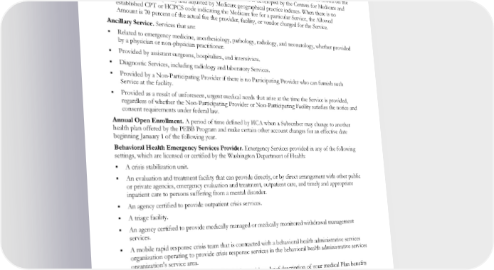 DEFINITIONS Allowed Amount. The lower of the following amounts: The actual fee the provider, facility, or vendor charged for the Service. 160 percent of the Medicare fee for the Service, as indicated by the applicable Current Procedural Terminology (CPT) code or Healthcare Common Procedure Coding System (HCPCS) code shown on the current Medicare fee schedule. The Medicare fee schedule is developed by the Centers for Medicare and Medicaid Services (CMS) and adjusted by Medicare geographical practice indexes. When there is no established CPT or HCPCS code indicating the Medicare fee for a particular Service, the Allowed Amount is 70 percent of the actual fee the provider, facility, or vendor charged for the Service. Ancillary Service. Services that are: Related to emergency medicine, anesthesiology, pathology, radiology, and neonatology, whether provided by a physician or non-physician practitioner. Provided by assistant surgeons, hospitalists, and intensivists. Diagnostic Services, including radiology and laboratory Services. Provided by a Non-Participating Provider if there is no Participating Provider who can furnish such Service at the facility. Provided as a result of unforeseen, urgent medical needs that arise at the time the Service is provided, regardless of whether the Non-Participating Provider or Non-Participating Facility satisfies the notice and consent requirements under federal law. Annual Open Enrollment. A period of time defined by HCA when a Subscriber may change to another health plan offered by the PEBB Program and make certain other account changes for an effective date beginning January 1 of the following year. Behavioral Health Emergency Services Provider. Emergency Services provided in any of the following settings, which are licensed or certified by the Washington Department of Health: A crisis stabilization unit. An evaluation and treatment facility that can provide directly, or by direct arrangement with other public or private agencies, emergency evaluation and treatment, outpatient care, and timely and appropriate inpatient care to persons suffering from a mental disorder. An agency certified to provide outpatient crisis services. A triage facility. An agency certified to provide medically managed or medically monitored withdrawal management services. A mobile rapid response crisis team that is contracted with a behavioral health administrative services organization operating to provide crisis response services in the behavioral health administrative services organization’s service area. Benefit Summary. A section of this EOC which provides a brief description of your medical Plan benefits and what you pay for covered Services. Evidence of Coverage (EOC). This Evidence of Coverage document provided to the Subscriber that specifies and describes benefits and conditions of coverage. After you enroll, you will receive a postcard that explains how you may either download an electronic copy of this EOC or request that this EOC be mailed to you. EWCLGHDHP1983ACT0124 8 WAPEBB-CD-ACT