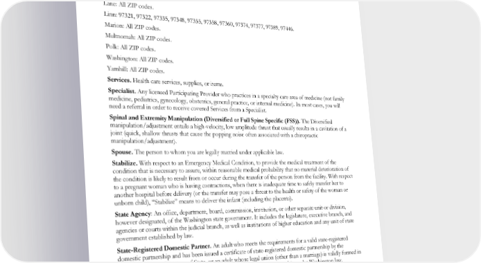Service Area. Our Service Area consists of Clark and Cowlitz counties in the state of Washington. In Oregon: Benton: 97330, 97331, 97333, 97339, 97370, 97456. Clackamas: All ZIP codes. Columbia: All ZIP codes. Hood River: 97014. Lane: All ZIP codes. Linn: 97321, 97322, 97335, 97348, 97355, 97358, 97360, 97374, 97377, 97389, 97446. Marion: All ZIP codes. Multnomah: All ZIP codes. Polk: All ZIP codes. Washington: All ZIP codes. Yamhill: All ZIP codes. Services. Health care services, supplies, or items. Specialist. Any licensed Participating Provider who practices in a specialty care area of medicine (not family medicine, pediatrics, gynecology, obstetrics, general practice, or internal medicine). In most cases, you will need a referral in order to receive covered Services from a Specialist. Spinal and Extremity Manipulation (Diversified or Full Spine Specific (FSS)). The Diversified manipulation/adjustment entails a high-velocity, low amplitude thrust that usually results in a cavitation of a joint (quick, shallow thrusts that cause the popping noise often associated with a chiropractic manipulation/adjustment). Spouse. The person to whom you are legally married under applicable law. Stabilize. With respect to an Emergency Medical Condition, to provide the medical treatment of the condition that is necessary to assure, within reasonable medical probability that no material deterioration of the condition is likely to result from or occur during the transfer of the person from the facility. With respect to a pregnant woman who is having contractions, when there is inadequate time to safely transfer her to another hospital before delivery (or the transfer may pose a threat to the health or safety of the woman or unborn child), “Stabilize” means to deliver the infant (including the placenta). State Agency: An office, department, board, commission, institution, or other separate unit or division, however designated, of the Washington state government. It includes the legislature, executive branch, and agencies or courts within the judicial branch, as well as institutions of higher education and any unit of state government established by law. State-Registered Domestic Partner. An adult who meets the requirements for a valid state-registered domestic partnership and has been issued a certificate of state-registered domestic partnership by the Washington State Secretary of State, or an adult whose legal union (other than a marriage) is validly formed in another jurisdiction and is substantially equivalent to a domestic partnership under Washington law. Subscriber. The employee or Continuation Coverage Enrollee who has been determined eligible and is enrolled in this plan and is the individual to whom the PEBB Program or Kaiser will issue notices, information, requests, and premium bills on behalf of an Enrollee. Substance Use Disorder. A substance-related or addictive disorder listed in the most current version of the Diagnostic and Statistical Manual of Mental Disorders (DSM) published by the American Psychiatric Association. EWCLGHDHP1983ACT0124 14 WAPEBB-CD-ACT