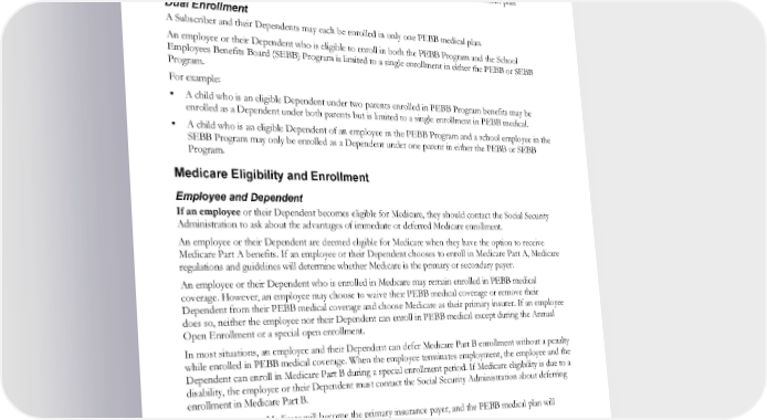 A Dependent will be removed from the Subscriber’s health plan coverage as described above in this section the last day of the month the NMSN is received. If that day is the first of the month, the change in enrollment will be made the last day of the previous month. When a NMSN requires a Subscriber’s Spouse, former Spouse, or other individual to provide health plan coverage for a Dependent who is already enrolled in the Subscriber’s PEBB coverage, and that health plan coverage is in fact provided, the Dependent may be removed from the Subscriber’s PEBB health plan coverage prospectively. Dual Enrollment A Subscriber and their Dependents may each be enrolled in only one PEBB medical plan. An employee or their Dependent who is eligible to enroll in both the PEBB Program and the School Employees Benefits Board (SEBB) Program is limited to a single enrollment in either the PEBB or SEBB Program. For example: A child who is an eligible Dependent under two parents enrolled in PEBB Program benefits may be enrolled as a Dependent under both parents but is limited to a single enrollment in PEBB medical. A child who is an eligible Dependent of an employee in the PEBB Program and a school employee in the SEBB Program may only be enrolled as a Dependent under one parent in either the PEBB or SEBB Program. Medicare Eligibility and Enrollment Employee and Dependent If an employee or their Dependent becomes eligible for Medicare, they should contact the Social Security Administration to ask about the advantages of immediate or deferred Medicare enrollment. An employee or their Dependent are deemed eligible for Medicare when they have the option to receive Medicare Part A benefits. If an employee or their Dependent chooses to enroll in Medicare Part A, Medicare regulations and guidelines will determine whether Medicare is the primary or secondary payer. An employee or their Dependent who is enrolled in Medicare may remain enrolled in PEBB medical coverage. However, an employee may choose to waive their PEBB medical coverage or remove their Dependent from their PEBB medical coverage and choose Medicare as their primary insurer. If an employee does so, neither the employee nor their Dependent can enroll in PEBB medical except during the Annual Open Enrollment or a special open enrollment. In most situations, an employee and their Dependent can defer Medicare Part B enrollment without a penalty while enrolled in PEBB medical coverage. When the employee terminates employment, the employee and the Dependent can enroll in Medicare Part B during a special enrollment period. If Medicare eligibility is due to a disability, the employee or their Dependent must contact the Social Security Administration about deferring enrollment in Medicare Part B. Upon retirement, Medicare will become the primary insurance payer, and the PEBB medical plan will become secondary. See “PEBB Retiree Insurance Coverage.” Continuation Coverage Subscriber, a retired employee of a former employer group, or their Dependent If a Continuation Coverage Subscriber, a retired employee of a former employer group, or their Dependent becomes eligible for Medicare, federal regulations allow enrollment in Medicare three months before they turn age 65. If they do not enroll within three months before the month they turn age 65, EWCLGHDHP1983ACT0124 19 WAPEBB-CD-ACT