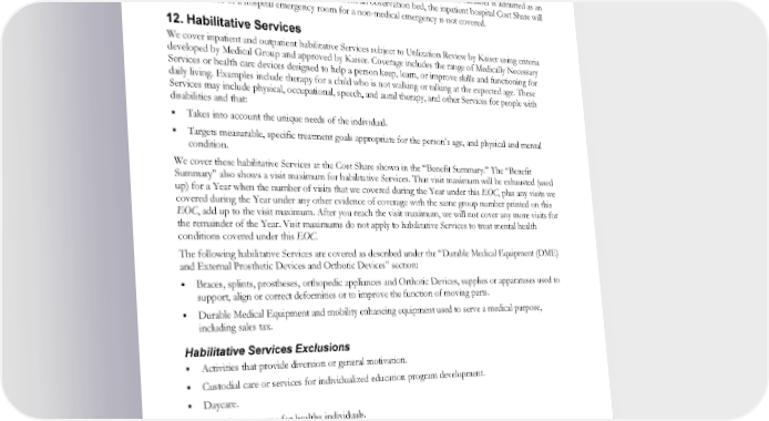 Internally implanted insulin pumps. Repair or replacement of External Prosthetic Devices and Orthotic Devices due to loss or misuse. 11. Emergency Services Emergency department visits at an emergency room facility are covered. If the Member is transferred from the emergency room to an observation bed, there is no additional Cost Share. If the Member is admitted as an inpatient directly from the emergency room or from an observation bed, the inpatient hospital Cost Share will be applied. Use of a hospital emergency room for a non-medical emergency is not covered. 12. Habilitative Services We cover inpatient and outpatient habilitative Services subject to Utilization Review by Kaiser using criteria developed by Medical Group and approved by Kaiser. Coverage includes the range of Medically Necessary Services or health care devices designed to help a person keep, learn, or improve skills and functioning for daily living. Examples include therapy for a child who is not walking or talking at the expected age. These Services may include physical, occupational, speech, and aural therapy, and other Services for people with disabilities and that: Takes into account the unique needs of the individual. Targets measurable, specific treatment goals appropriate for the person’s age, and physical and mental condition. We cover these habilitative Services at the Cost Share shown in the “Benefit Summary.” The “Benefit Summary” also shows a visit maximum for habilitative Services. That visit maximum will be exhausted (used up) for a Year when the number of visits that we covered during the Year under this EOC, plus any visits we covered during the Year under any other evidence of coverage with the same group number printed on this EOC, add up to the visit maximum. After you reach the visit maximum, we will not cover any more visits for the remainder of the Year. Visit maximums do not apply to habilitative Services to treat mental health conditions covered under this EOC. The following habilitative Services are covered as described under the “Durable Medical Equipment (DME) and External Prosthetic Devices and Orthotic Devices” section: Braces, splints, prostheses, orthopedic appliances and Orthotic Devices, supplies or apparatuses used to support, align or correct deformities or to improve the function of moving parts. Durable Medical Equipment and mobility enhancing equipment used to serve a medical purpose, including sales tax. Habilitative Services Exclusions Activities that provide diversion or general motivation. Custodial care or services for individualized education program development. Daycare. Exercise programs for healthy individuals. Housing. Recreational activities. Respite care. Services and devices delivered pursuant to federal Individuals with Disabilities Education Act of 2004 (IDEA) requirements. EWCLGHDHP1983ACT0124 46 WAPEBB-CD-ACT