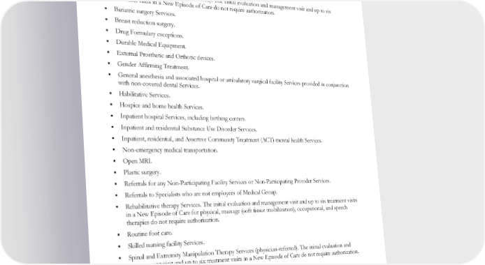 within three calendar days after we receive the request. If the request was received orally or in writing and is denied, we will send a letter to you within five calendar days after we receive the request. The decision letter will explain the reason for the determination along with instructions for filing an appeal. You may request a copy of the complete Utilization Review criteria used to make the determination by calling Member Services. Your PCP or Participating Provider will request authorization when necessary. The following are examples of Services that require prior, concurrent, or post-service authorization: Acupuncture Services (physician referred). The initial evaluation and management visit and up to six treatment visits in a New Episode of Care do not require authorization. Bariatric surgery Services. Breast reduction surgery. Drug Formulary exceptions. Durable Medical Equipment. External Prosthetic and Orthotic devices. Gender Affirming Treatment. General anesthesia and associated hospital or ambulatory surgical facility Services provided in conjunction with non-covered dental Services. Habilitative Services. Hospice and home health Services. Inpatient hospital Services, including birthing centers. Inpatient and residential Substance Use Disorder Services. Inpatient, residential, and Assertive Community Treatment (ACT) mental health Services. Non-emergency medical transportation. Open MRI. Plastic surgery. Referrals for any Non-Participating Facility Services or Non-Participating Provider Services. Referrals to Specialists who are not employees of Medical Group. Rehabilitative therapy Services. The initial evaluation and management visit and up to six treatment visits in a New Episode of Care for physical, massage (soft tissue mobilization), occupational, and speech therapies do not require authorization. Routine foot care. Skilled nursing facility Services. Spinal and Extremity Manipulation Therapy Services (physician-referred). The initial evaluation and management visit and up to six treatment visits in a New Episode of Care do not require authorization. Organ transplant Services. Transgender Surgical Services. Travel and lodging expenses. If you ask for Services that the Participating Provider believes are not Medically Necessary and does not submit a request on your behalf, you may ask for a second opinion from another Participating Provider. You EWCLGHDHP1983ACT0124 33 WAPEBB-CD-ACT