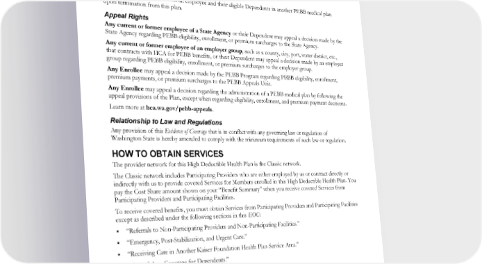 Misconduct. Examples of such termination include, but are not limited to the following: • Fraud, intentional misrepresentation or withholding of information the Subscriber knew or should have known was material or necessary to accurately determine eligibility or the correct premium • Abusive or threatening conduct repeatedly directed to an HCA employee, a health plan, or other HCA contracted vendor providing PEBB insurance coverage on behalf of HCA, its employees, or other persons The PEBB Program will enroll an employee and their eligible Dependents in another PEBB medical plan upon termination from this plan. Appeal Rights Any current or former employee of a State Agency or their Dependent may appeal a decision made by the State Agency regarding PEBB eligibility, enrollment, or premium surcharges to the State Agency. Any current or former employee of an employer group, such as a county, city, port, water district, etc., that contracts with HCA for PEBB benefits, or their Dependent may appeal a decision made by an employer group regarding PEBB eligibility, enrollment, or premium surcharges to the employer group. Any Enrollee may appeal a decision made by the PEBB Program regarding PEBB eligibility, enrollment, premium payments, or premium surcharges to the PEBB Appeals Unit. Any Enrollee may appeal a decision regarding the administration of a PEBB medical plan by following the appeal provisions of the Plan, except when regarding eligibility, enrollment, and premium payment decisions. Learn more at hca.wa.gov/pebb-appeals. Relationship to Law and Regulations Any provision of this Evidence of Coverage that is in conflict with any governing law or regulation of Washington State is hereby amended to comply with the minimum requirements of such law or regulation. HOW TO OBTAIN SERVICES The provider network for this High Deductible Health Plan is the Classic network. The Classic network includes Participating Providers who are either employed by us or contract directly or indirectly with us to provide covered Services for Members enrolled in this High Deductible Health Plan. You pay the Cost Share amount shown on your “Benefit Summary” when you receive covered Services from Participating Providers and Participating Facilities. To receive covered benefits, you must obtain Services from Participating Providers and Participating Facilities except as described under the following sections in this EOC: “Referrals to Non-Participating Providers and Non-Participating Facilities.” “Emergency, Post-Stabilization, and Urgent Care.” “Receiving Care in Another Kaiser Foundation Health Plan Service Area.” “Out-of-Area Coverage for Dependents.” “Ambulance Services.” To locate a Participating Provider or Participating Facility, contact Member Services or visit kp.org/doctors to see all Kaiser Permanente locations near you, search for Participating Providers, and read online provider profiles. We will not directly or indirectly prohibit you from freely contracting at any time to obtain health care Services from Non-Participating Providers and Non-Participating Facilities outside the Plan. However, if you EWCLGHDHP1983ACT0124 30 WAPEBB-CD-ACT