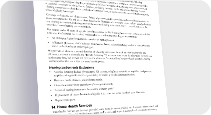 Services solely for palliative purposes. Social services. Specialized job testing. 13. Hearing Instruments We cover Medically Necessary Services for the treatment of hearing loss as described in this “Hearing Instruments” section. Hearing instruments means any wearable prosthetic instrument or device designed for aiding, improving, compensating for, or correcting defective human hearing, and any parts, attachments, or accessories necessary for the device to function, excluding batteries, cords, and assistive listening devices. Hearing instruments include bone conduction hearing devices, as an alternative to conventional hearing aids, when Medically Necessary. Coverage includes the initial assessment, fitting, adjustment, auditory training, and ear molds as necessary to maintain optimal fit. We will cover these Services for Members who intend to obtain or have already obtained any hearing instrument, including an over-the-counter hearing instrument; however, we will not cover the over-the-counter hearing instrument itself. For minors under 18 years of age, the benefits described in this “Hearing Instruments” section are available only after the Member has received medical clearance within the preceding six months from: An otolaryngologist for an initial evaluation of hearing loss; or A licensed physician, which indicates there has not been a substantial change in clinical status since the initial evaluation by an otolaryngologist. We provide an allowance toward the price of a hearing instrument for each ear with hearing loss. The allowance amount is shown in the “Benefit Summary.” You do not have to use the allowances for both ears at the same time, but we will not provide the allowance for an ear if we have previously covered a hearing instrument for that ear within the same benefit period. Hearing Instruments Exclusions Assistive listening devices (for example, FM systems, cell phone or telephone amplifiers, and personal amplifiers designed to improve your ability to hear in a specific listening situation). Batteries, cords, cleaners, and moisture guards. Over-the-counter (non-prescription) hearing instruments. Repair of hearing instruments beyond the warranty period. Replacement of lost or broken hearing aids if you have exhausted (used up) your allowance. Replacement parts. 14. Home Health Services Home health Services are Services provided in the home by nurses, medical social workers, mental health and Substance Use Disorder professionals, home health aides, and physical, occupational, speech and respiratory therapists. We cover home health Services only if all of the following are true: You are substantially confined to your home (or to a place of temporary or permanent residence used as your home) or the care is provided in lieu of Medically Necessary hospitalization. A Medical Group physician determines that it is feasible to maintain effective supervision and control of your care in your home and that the Services can be safely and effectively provided in your home. EWCLGHDHP1983ACT0124 47 WAPEBB-CD-ACT