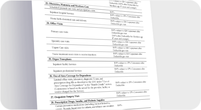 COVERED SERVICE BENEFIT 100% subject to $20 Copayment after Partial hospitalization Deductible per office visit or per day (100% after Deductible for Members age 17 years and younger) 22. Naturopathic Medicine 100% subject to $20 Copayment after Evaluation and treatment Deductible (100% after Deductible for Members age 17 years and younger) 23. Obstetrics, Maternity and Newborn Care Scheduled prenatal care visits and postpartum visits 100% Inpatient hospital Services 100% subject to 15% Coinsurance after Deductible Home birth obstetrical care and delivery 100% subject to $30 Copayment after Deductible per visit 24. Office Visits 100% subject to $20 Copayment after Primary care visits Deductible per visit (100% after Deductible for Members age 17 years and younger) Specialty care visits 100% subject to $30 Copayment after Deductible per visit Urgent Care visits 100% subject to $40 Copayment after Deductible per visit Nurse treatment room visits to receive injections 100% subject to $10 Copayment after Deductible per visit 25. Organ Transplants Inpatient facility Services 100% subject to 15% Coinsurance after Deductible Inpatient professional Services 100% subject to 15% Coinsurance after Deductible 26. Out-of-Area Coverage for Dependents Limited office visits, laboratory, diagnostic X-rays, and prescription drug fills as described in the EOC under “Out-of- 100% subject to 20% Coinsurance after Area Coverage for Dependents” in the “Benefit Details” section. Deductible (Coinsurance is based on the actual fee the provider, facility or vendor charged for the Service). 27. Outpatient Surgery Visit 100% subject to 15% Coinsurance after Deductible 28. Prescription Drugs, Insulin, and Diabetic Supplies Certain preventive medications (including, but not limited to, aspirin, fluoride, liquid iron for infants, and tobacco use cessation 100% drugs) Certain self-administered IV drugs, fluids, additives, and nutrients including the supplies and equipment required for their 100% after Deductible administration Blood glucose test strips Subject to the generic drug tier Copayment or Coinsurance FDA approved prescription and over-the-counter contraceptive 100% drugs or devices EWCLGHDHP1983ACT0124 4 WAPEBB-CD-ACT