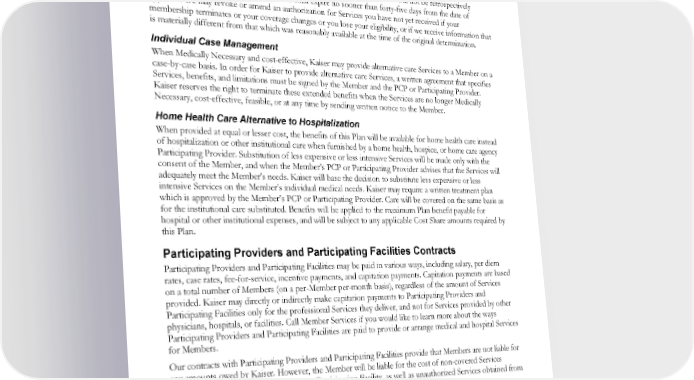 should contact the manager in the area where the Participating Provider is located. Member Services can connect you with the correct manager, who will listen to your issues and discuss your options. For more information about Utilization Review, a copy of the complete Utilization Review criteria developed by Medical Group and approved by Kaiser for a specific condition, or to talk to a Utilization Review staff person, please contact Member Services. Except in the case of misrepresentation, prior authorization review decisions will not be retrospectively denied. Prior authorization determinations shall expire no sooner than forty-five days from the date of approval. We may revoke or amend an authorization for Services you have not yet received if your membership terminates or your coverage changes or you lose your eligibility, or if we receive information that is materially different from that which was reasonably available at the time of the original determination. Individual Case Management When Medically Necessary and cost-effective, Kaiser may provide alternative care Services to a Member on a case-by-case basis. In order for Kaiser to provide alternative care Services, a written agreement that specifies Services, benefits, and limitations must be signed by the Member and the PCP or Participating Provider. Kaiser reserves the right to terminate these extended benefits when the Services are no longer Medically Necessary, cost-effective, feasible, or at any time by sending written notice to the Member. Home Health Care Alternative to Hospitalization When provided at equal or lesser cost, the benefits of this Plan will be available for home health care instead of hospitalization or other institutional care when furnished by a home health, hospice, or home care agency Participating Provider. Substitution of less expensive or less intensive Services will be made only with the consent of the Member, and when the Member’s PCP or Participating Provider advises that the Services will adequately meet the Member’s needs. Kaiser will base the decision to substitute less expensive or less intensive Services on the Member’s individual medical needs. Kaiser may require a written treatment plan which is approved by the Member’s PCP or Participating Provider. Care will be covered on the same basis as for the institutional care substituted. Benefits will be applied to the maximum Plan benefit payable for hospital or other institutional expenses, and will be subject to any applicable Cost Share amounts required by this Plan. Participating Providers and Participating Facilities Contracts Participating Providers and Participating Facilities may be paid in various ways, including salary, per diem rates, case rates, fee-for-service, incentive payments, and capitation payments. Capitation payments are based on a total number of Members (on a per-Member per-month basis), regardless of the amount of Services provided. Kaiser may directly or indirectly make capitation payments to Participating Providers and Participating Facilities only for the professional Services they deliver, and not for Services provided by other physicians, hospitals, or facilities. Call Member Services if you would like to learn more about the ways Participating Providers and Participating Facilities are paid to provide or arrange medical and hospital Services for Members. Our contracts with Participating Providers and Participating Facilities provide that Members are not liable for any amounts owed by Kaiser. However, the Member will be liable for the cost of non-covered Services received from a Participating Provider or Participating Facility, as well as unauthorized Services obtained from Non-Participating Providers and Non-Participating Facilities. Provider Whose Contract Terminates You may be eligible to continue receiving covered Services from a Participating Provider for a limited period of time after our contract with the Participating Provider terminates. EWCLGHDHP1983ACT0124 34 WAPEBB-CD-ACT