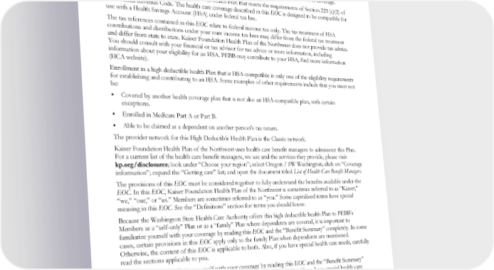 INTRODUCTION This Evidence of Coverage (EOC), including the “Benefit Summary,” describes the health care benefits of this Plan provided under the Administrative Services Contract (Contract) between Kaiser Foundation Health Plan of the Northwest and the Washington State Health Care Authority (HCA) for the Public Employees Benefits Board (PEBB) Program. In the event of a conflict in language between the Plan Contract and the EOC, the EOC will govern. For benefits provided under any other Plan, refer to that Plan’s evidence of coverage. This health benefit Plan is a high deductible health Plan that meets the requirements of Section 223 (c)(2) of the Internal Revenue Code. The health care coverage described in this EOC is designed to be compatible for use with a Health Savings Account (HSA) under federal tax law. The tax references contained in this EOC relate to federal income tax only. The tax treatment of HSA contributions and distributions under your state income tax laws may differ from the federal tax treatment and differ from state to state. Kaiser Foundation Health Plan of the Northwest does not provide tax advice. You should consult with your financial or tax advisor for tax advice or more information, including information about your eligibility for an HSA. PEBB may contribute to your HSA, find more information (HCA website). Enrollment in a high deductible health Plan that is HSA-compatible is only one of the eligibility requirements for establishing and contributing to an HSA. Some examples of other requirements include that you must not be: Covered by another health coverage plan that is not also an HSA-compatible plan, with certain exceptions. Enrolled in Medicare Part A or Part B. Able to be claimed as a dependent on another person’s tax return. The provider network for this High Deductible Health Plan is the Classic network. Kaiser Foundation Health Plan of the Northwest uses health care benefit managers to administer this Plan. For a current list of the health care benefit managers, we use and the services they provide, please visit kp.org/disclosures; look under “Choose your region”; select Oregon / SW Washington; click on “Coverage information”; expand the “Getting care” list; and open the document titled List of Health Care Benefit Managers. The provisions of this EOC must be considered together to fully understand the benefits available under the EOC. In this EOC, Kaiser Foundation Health Plan of the Northwest is sometimes referred to as “Kaiser,” “we,” “our,” or “us.” Members are sometimes referred to as “you.” Some capitalized terms have special meaning in this EOC. See the “Definitions” section for terms you should know. Because the Washington State Health Care Authority offers this high deductible health Plan to PEBB’s Members as a “self-only” Plan or as a “family” Plan where dependents are covered, it is important to familiarize yourself with your coverage by reading this EOC and the “Benefit Summary” completely. In some cases, certain provisions in this EOC apply only to the family Plan when dependents are mentioned. Otherwise, the content of this EOC is applicable to both. Also, if you have special health care needs, carefully read the sections applicable to you. It is important to familiarize yourself with your coverage by reading this EOC and the “Benefit Summary” completely, so that you can take full advantage of your Plan benefits. Also, if you have special health care needs, carefully read the sections applicable to you. If you would like additional information about your benefits, important health plan disclosures, or other products or services, please call Member Services or you may also e-mail us by registering at kp.org. EWCLGHDHP1983ACT0124 7 WAPEBB-CD-ACT