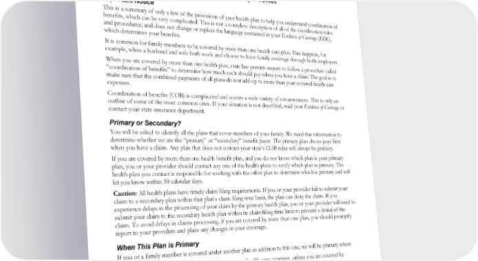 KAISER FOUNDATION HEALTH PLAN OF THE NORTHWEST A Nonprofit Corporation Coordination of Benefits Consumer Explanatory Booklet Important Notice This is a summary of only a few of the provisions of your health plan to help you understand coordination of benefits, which can be very complicated. This is not a complete description of all of the coordination rules and procedures, and does not change or replace the language contained in your Evidence of Coverage (EOC), which determines your benefits. It is common for family members to be covered by more than one health care plan. This happens, for example, when a husband and wife both work and choose to have family coverage through both employers. When you are covered by more than one health plan, state law permits issuers to follow a procedure called “coordination of benefits” to determine how much each should pay when you have a claim. The goal is to make sure that the combined payments of all plans do not add up to more than your covered health care expenses. Coordination of benefits (COB) is complicated and covers a wide variety of circumstances. This is only an outline of some of the most common ones. If your situation is not described, read your Evidence of Coverage or contact your state insurance department. Primary or Secondary? You will be asked to identify all the plans that cover members of your family. We need this information to determine whether we are the “primary” or “secondary” benefit payer. The primary plan always pays first when you have a claim. Any plan that does not contain your state’s COB rules will always be primary. If you are covered by more than one health benefit plan, and you do not know which plan is your primary plan, you or your provider should contact any one of the health plans to verify which plan is primary. The health plan you contact is responsible for working with the other plan to determine which is primary and will let you know within 30 calendar days. Caution: All health plans have timely claim filing requirements. If you or your provider fail to submit your claim to a secondary plan within that plan’s claim filing time limit, the plan can deny the claim. If you experience delays in the processing of your claim by the primary health plan, you or your provider will need to submit your claim to the secondary health plan within its claim filing time limit to prevent a denial of the claim. To avoid delays in claims processing, if you are covered by more than one plan, you should promptly report to your providers and plans any changes in your coverage. When This Plan is Primary If you or a family member is covered under another plan in addition to this one, we will be primary when: Your Own Expenses. The claim is for your own health care expenses, unless you are covered by Medicare and both you and your spouse are retired. Your Spouse’s Expenses. The claim is for your spouse, who is covered by Medicare, and you are not both retired. CWCOB0124 1
