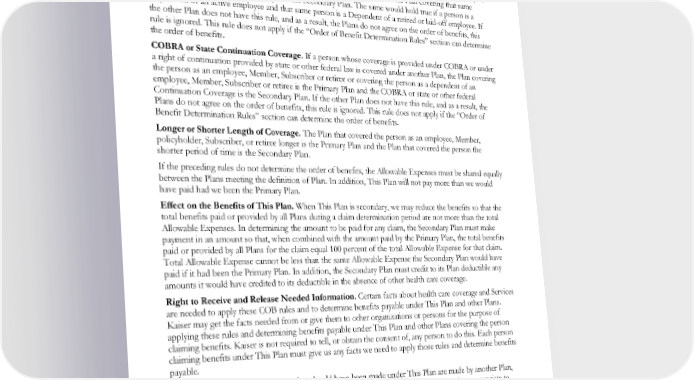 4. The Plan covering the spouse of the non-Custodial Parent. For a Dependent child covered under more than one Plan of individuals who are not the parents of the child, the above provisions determine the order of benefits as if those individuals were the parents of the child. Active Employee or Retired or Laid-off Employee. The Plan that covers a person as an active employee, that is, an employee who is neither laid off nor retired, is the Primary Plan. The Plan covering that same person as a retired or laid-off employee is the Secondary Plan. The same would hold true if a person is a Dependent of an active employee and that same person is a Dependent of a retired or laid-off employee. If the other Plan does not have this rule, and as a result, the Plans do not agree on the order of benefits, this rule is ignored. This rule does not apply if the “Order of Benefit Determination Rules” section can determine the order of benefits. COBRA or State Continuation Coverage. If a person whose coverage is provided under COBRA or under a right of continuation provided by state or other federal law is covered under another Plan, the Plan covering the person as an employee, Member, Subscriber or retiree or covering the person as a dependent of an employee, Member, Subscriber or retiree is the Primary Plan and the COBRA or state or other federal Continuation Coverage is the Secondary Plan. If the other Plan does not have this rule, and as a result, the Plans do not agree on the order of benefits, this rule is ignored. This rule does not apply if the “Order of Benefit Determination Rules” section can determine the order of benefits. Longer or Shorter Length of Coverage. The Plan that covered the person as an employee, Member, policyholder, Subscriber, or retiree longer is the Primary Plan and the Plan that covered the person the shorter period of time is the Secondary Plan. If the preceding rules do not determine the order of benefits, the Allowable Expenses must be shared equally between the Plans meeting the definition of Plan. In addition, This Plan will not pay more than we would have paid had we been the Primary Plan. Effect on the Benefits of This Plan. When This Plan is secondary, we may reduce the benefits so that the total benefits paid or provided by all Plans during a claim determination period are not more than the total Allowable Expenses. In determining the amount to be paid for any claim, the Secondary Plan must make payment in an amount so that, when combined with the amount paid by the Primary Plan, the total benefits paid or provided by all Plans for the claim equal 100 percent of the total Allowable Expense for that claim. Total Allowable Expense cannot be less than the same Allowable Expense the Secondary Plan would have paid if it had been the Primary Plan. In addition, the Secondary Plan must credit to its Plan deductible any amounts it would have credited to its deductible in the absence of other health care coverage. Right to Receive and Release Needed Information. Certain facts about health care coverage and Services are needed to apply these COB rules and to determine benefits payable under This Plan and other Plans. Kaiser may get the facts needed from or give them to other organizations or persons for the purpose of applying these rules and determining benefits payable under This Plan and other Plans covering the person claiming benefits. Kaiser is not required to tell, or obtain the consent of, any person to do this. Each person claiming benefits under This Plan must give us any facts we need to apply those rules and determine benefits payable. Facility of Payment. If payments that should have been made under This Plan are made by another Plan, Kaiser has the right, at our discretion, to remit to the other Plan the amount we determine appropriate to satisfy the intent of this provision. The amounts paid to the other Plan are considered benefits paid under This Plan. To the extent of these payments, Kaiser is fully discharged from liability under This Plan. EWCLGHDHP1983ACT0124 80 WAPEBB-CD-ACT