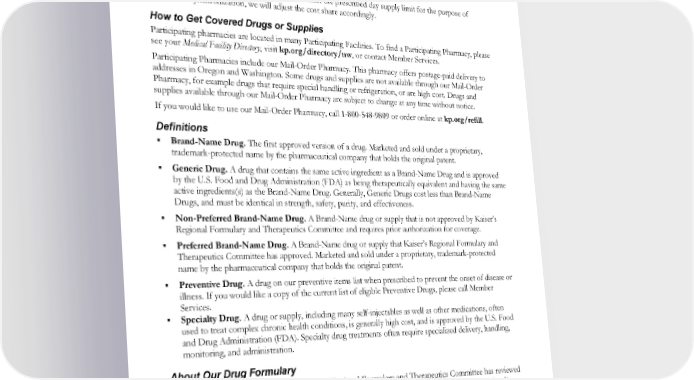 Medication Synchronization Medication synchronization is the coordination of medication refills, if you are taking two or more medications for a chronic condition, so that your medications are refilled on the same schedule. You may request medication synchronization for a new prescription from the prescribing provider or a Participating Pharmacy who will determine the appropriateness of medication synchronization for the drugs being dispensed and inform you of the decision. If the prescription will be filled to more or less than the prescribed day supply limit for the purpose of medication synchronization, we will adjust the cost share accordingly. How to Get Covered Drugs or Supplies Participating pharmacies are located in many Participating Facilities. To find a Participating Pharmacy, please see your Medical Facility Directory, visit kp.org/directory/nw, or contact Member Services. Participating Pharmacies include our Mail-Order Pharmacy. This pharmacy offers postage-paid delivery to addresses in Oregon and Washington. Some drugs and supplies are not available through our Mail-Order Pharmacy, for example drugs that require special handling or refrigeration, or are high cost. Drugs and supplies available through our Mail-Order Pharmacy are subject to change at any time without notice. If you would like to use our Mail-Order Pharmacy, call 1-800-548-9809 or order online at kp.org/refill. Definitions Brand-Name Drug. The first approved version of a drug. Marketed and sold under a proprietary, trademark-protected name by the pharmaceutical company that holds the original patent. Generic Drug. A drug that contains the same active ingredient as a Brand-Name Drug and is approved by the U.S. Food and Drug Administration (FDA) as being therapeutically equivalent and having the same active ingredients(s) as the Brand-Name Drug. Generally, Generic Drugs cost less than Brand-Name Drugs, and must be identical in strength, safety, purity, and effectiveness. Non-Preferred Brand-Name Drug. A Brand-Name drug or supply that is not approved by Kaiser’s Regional Formulary and Therapeutics Committee and requires prior authorization for coverage. Preferred Brand-Name Drug. A Brand-Name drug or supply that Kaiser’s Regional Formulary and Therapeutics Committee has approved. Marketed and sold under a proprietary, trademark-protected name by the pharmaceutical company that holds the original patent. Preventive Drug. A drug on our preventive items list when prescribed to prevent the onset of disease or illness. If you would like a copy of the current list of eligible Preventive Drugs, please call Member Services. Specialty Drug. A drug or supply, including many self-injectables as well as other medications, often used to treat complex chronic health conditions, is generally high cost, and is approved by the U.S. Food and Drug Administration (FDA). Specialty drug treatments often require specialized delivery, handling, monitoring, and administration. About Our Drug Formulary Our drug Formulary is a list of drugs that our Regional Formulary and Therapeutics Committee has reviewed and approved for our Members and includes drugs covered under this section “Prescription drugs, insulin, and diabetic supplies.” Drugs on the Formulary have been approved by the FDA. Our Regional Formulary and Therapeutics Committee is made up of Participating Physicians, other Participating Providers, pharmacists, and administrative staff. The committee chooses drugs for the Formulary based on several factors, including safety and effectiveness as determined from a review of the scientific literature. They may not approve a drug if there is not enough scientific evidence that it is clinically EWCLGHDHP1983ACT0124 60 WAPEBB-CD-ACT