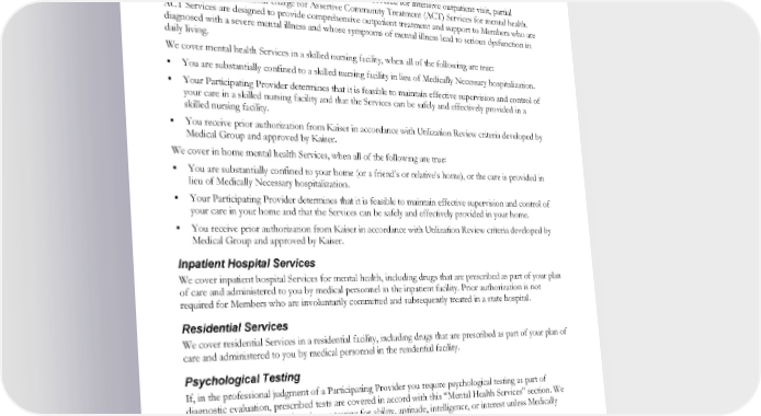 This Plan will cover court-ordered treatment only if determined to be Medically Necessary by a Participating Provider. All costs for mental health Services in excess of the coverage provided under this EOC, including the cost of any care for which the Member failed to obtain prior authorization, or any Services received from someone other than a Participating Provider will be the Member’s sole responsibility to pay. Outpatient Services Services for diagnosis and treatment of mental illness are covered for intensive outpatient visit, partial hospitalization, and without charge for Assertive Community Treatment (ACT) Services for mental health. ACT Services are designed to provide comprehensive outpatient treatment and support to Members who are diagnosed with a severe mental illness and whose symptoms of mental illness lead to serious dysfunction in daily living. We cover mental health Services in a skilled nursing facility, when all of the following are true: You are substantially confined to a skilled nursing facility in lieu of Medically Necessary hospitalization. Your Participating Provider determines that it is feasible to maintain effective supervision and control of your care in a skilled nursing facility and that the Services can be safely and effectively provided in a skilled nursing facility. You receive prior authorization from Kaiser in accordance with Utilization Review criteria developed by Medical Group and approved by Kaiser. We cover in home mental health Services, when all of the following are true: You are substantially confined to your home (or a friend’s or relative’s home), or the care is provided in lieu of Medically Necessary hospitalization. Your Participating Provider determines that it is feasible to maintain effective supervision and control of your care in your home and that the Services can be safely and effectively provided in your home. You receive prior authorization from Kaiser in accordance with Utilization Review criteria developed by Medical Group and approved by Kaiser. Inpatient Hospital Services We cover inpatient hospital Services for mental health, including drugs that are prescribed as part of your plan of care and administered to you by medical personnel in the inpatient facility. Prior authorization is not required for Members who are involuntarily committed and subsequently treated in a state hospital. Residential Services We cover residential Services in a residential facility, including drugs that are prescribed as part of your plan of care and administered to you by medical personnel in the residential facility. Psychological Testing If, in the professional judgment of a Participating Provider you require psychological testing as part of diagnostic evaluation, prescribed tests are covered in accord with this “Mental Health Services” section. We do not cover court-ordered testing or testing for ability, aptitude, intelligence, or interest unless Medically Necessary. 22. Naturopathic Medicine We cover outpatient visits for naturopathic medicine Services when provided by a Participating Provider in the Participating Provider’s office. You do not need a referral or prior authorization. EWCLGHDHP1983ACT0124 54 WAPEBB-CD-ACT