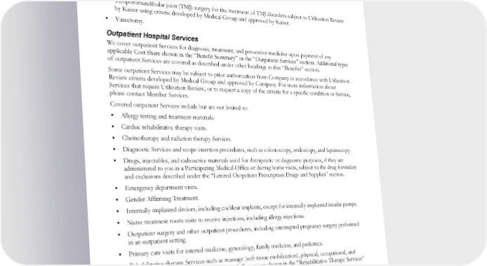 Prescription drugs, including injections. Rehabilitative therapy Services such as massage (soft tissue mobilization), physical, occupational, and speech therapy Services. Respiratory therapy. Room and board, including a private room if Medically Necessary. Specialized care and critical care units. Temporomandibular joint (TMJ) surgery for the treatment of TMJ disorders subject to Utilization Review by Kaiser using criteria developed by Medical Group and approved by Kaiser. Vasectomy. Outpatient Hospital Services We cover outpatient Services for diagnosis, treatment, and preventive medicine upon payment of any applicable Cost Share shown in the “Benefit Summary” in the “Outpatient Services” section. Additional types of outpatient Services are covered as described under other headings in this “Benefits” section. Some outpatient Services may be subject to prior authorization from Company in accordance with Utilization Review criteria developed by Medical Group and approved by Company. For more information about Services that require Utilization Review, or to request a copy of the criteria for a specific condition or Service, please contact Member Services. Covered outpatient Services include but are not limited to: Allergy testing and treatment materials. Cardiac rehabilitative therapy visits. Chemotherapy and radiation therapy Services. Diagnostic Services and scope insertion procedures, such as colonoscopy, endoscopy, and laparoscopy. Drugs, injectables, and radioactive materials used for therapeutic or diagnostic purposes, if they are administered to you in a Participating Medical Office or during home visits, subject to the drug formulary and exclusions described under the “Limited Outpatient Prescription Drugs and Supplies” section. Emergency department visits. Gender Affirming Treatment. Internally implanted devices, including cochlear implants, except for internally implanted insulin pumps. Nurse treatment room visits to receive injections, including allergy injections. Outpatient surgery and other outpatient procedures, including interrupted pregnancy surgery performed in an outpatient setting. Primary care visits for internal medicine, gynecology, family medicine, and pediatrics. Rehabilitative therapy Services such as massage (soft tissue mobilization), physical, occupational, and speech therapy Services, subject to the benefit limitations shown in the “Rehabilitative Therapy Services” section of the “Benefit Summary.” Respiratory therapy. Routine eye exams. Routine hearing exams. Specialty care visits (includes home birth). EWCLGHDHP1983ACT0124 50 WAPEBB-CD-ACT