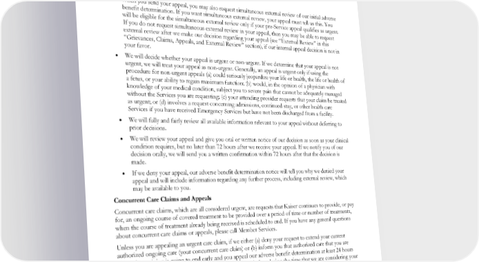 Your request and the supporting documents constitute your appeal. You must call Member Services, mail, or fax your appeal to us at: Kaiser Foundation Health Plan of the Northwest Member Relations Department 500 N.E. Multnomah St., Suite 100 Portland, OR 97232-2099 Fax: 1-855-347-7239 • When you send your appeal, you may also request simultaneous external review of our initial adverse benefit determination. If you want simultaneous external review, your appeal must tell us this. You will be eligible for the simultaneous external review only if your pre-Service appeal qualifies as urgent. If you do not request simultaneous external review in your appeal, then you may be able to request external review after we make our decision regarding your appeal (see “External Review” in this “Grievances, Claims, Appeals, and External Review” section), if our internal appeal decision is not in your favor. • We will decide whether your appeal is urgent or non-urgent. If we determine that your appeal is not urgent, we will treat your appeal as non-urgent. Generally, an appeal is urgent only if using the procedure for non-urgent appeals (a) could seriously jeopardize your life or health, the life or health of a fetus, or your ability to regain maximum function; (b) would, in the opinion of a physician with knowledge of your medical condition, subject you to severe pain that cannot be adequately managed without the Services you are requesting; (c) your attending provider requests that your claim be treated as urgent; or (d) involves a request concerning admissions, continued stay, or other health care Services if you have received Emergency Services but have not been discharged from a facility. • We will fully and fairly review all available information relevant to your appeal without deferring to prior decisions. • We will review your appeal and give you oral or written notice of our decision as soon as your clinical condition requires, but no later than 72 hours after we receive your appeal. If we notify you of our decision orally, we will send you a written confirmation within 72 hours after that the decision is made. • If we deny your appeal, our adverse benefit determination notice will tell you why we denied your appeal and will include information regarding any further process, including external review, which may be available to you. Concurrent Care Claims and Appeals Concurrent care claims, which are all considered urgent, are requests that Kaiser continues to provide, or pay for, an ongoing course of covered treatment to be provided over a period of time or number of treatments, when the course of treatment already being received is scheduled to end. If you have any general questions about concurrent care claims or appeals, please call Member Services. Unless you are appealing an urgent care claim, if we either (a) deny your request to extend your current authorized ongoing care (your concurrent care claim) or (b) inform you that authorized care that you are currently receiving is going to end early and you appeal our adverse benefit determination at least 24 hours before your ongoing course of covered treatment will end, then during the time that we are considering your appeal, you may continue to receive the authorized Services. If you continue to receive these Services while we consider your appeal and your appeal does not result in our approval of your concurrent care claim, then you will have to pay for the Services that we decide are not covered. Here are the procedures for filing a concurrent care claim and a concurrent care appeal: EWCLGHDHP1983ACT0124 89 WAPEBB-CD-ACT