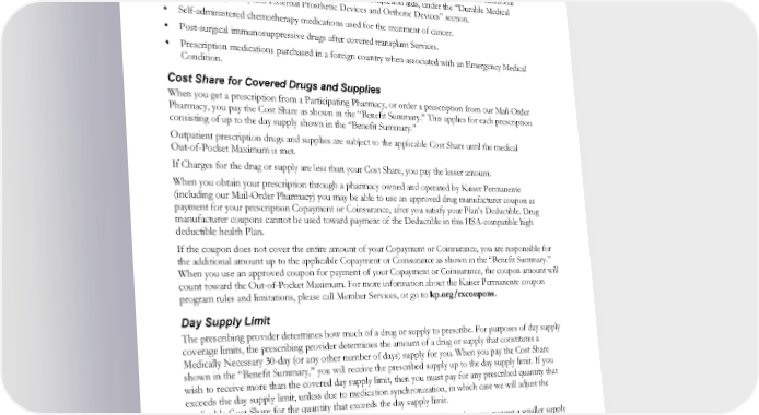 FDA approved prescription and over-the-counter contraceptive drugs and devices including injectable contraceptives and internally implanted time-release contraceptive drugs, emergency contraceptives, spermicide, and contraceptive devices such as condoms, intrauterine devices, diaphragms, and cervical caps. Glucagon emergency kits, insulin, ketone test strips for urine-testing, blood glucose test strips, and disposable needles and syringes when prescribed for the treatment of diabetes. We cover additional diabetic equipment and supplies, including lancets and injection aids, under the “Durable Medical Equipment (DME) and External Prosthetic Devices and Orthotic Devices” section. Self-administered chemotherapy medications used for the treatment of cancer. Post-surgical immunosuppressive drugs after covered transplant Services. Prescription medications purchased in a foreign country when associated with an Emergency Medical Condition. Cost Share for Covered Drugs and Supplies When you get a prescription from a Participating Pharmacy, or order a prescription from our Mail-Order Pharmacy, you pay the Cost Share as shown in the “Benefit Summary.” This applies for each prescription consisting of up to the day supply shown in the “Benefit Summary.” Outpatient prescription drugs and supplies are subject to the applicable Cost Share until the medical Out-of-Pocket Maximum is met. If Charges for the drug or supply are less than your Cost Share, you pay the lesser amount. When you obtain your prescription through a pharmacy owned and operated by Kaiser Permanente (including our Mail-Order Pharmacy) you may be able to use an approved drug manufacturer coupon as payment for your prescription Copayment or Coinsurance, after you satisfy your Plan’s Deductible. Drug manufacturer coupons cannot be used toward payment of the Deductible in this HSA-compatible high deductible health Plan. If the coupon does not cover the entire amount of your Copayment or Coinsurance, you are responsible for the additional amount up to the applicable Copayment or Coinsurance as shown in the “Benefit Summary.” When you use an approved coupon for payment of your Copayment or Coinsurance, the coupon amount will count toward the Out-of-Pocket Maximum. For more information about the Kaiser Permanente coupon program rules and limitations, please call Member Services, or go to kp.org/rxcoupons. Day Supply Limit The prescribing provider determines how much of a drug or supply to prescribe. For purposes of day supply coverage limits, the prescribing provider determines the amount of a drug or supply that constitutes a Medically Necessary 30-day (or any other number of days) supply for you. When you pay the Cost Share shown in the “Benefit Summary,” you will receive the prescribed supply up to the day supply limit. If you wish to receive more than the covered day supply limit, then you must pay for any prescribed quantity that exceeds the day supply limit, unless due to medication synchronization, in which case we will adjust the applicable Cost Share for the quantity that exceeds the day supply limit. You may receive a 12-month supply of a contraceptive drug at one time, unless you request a smaller supply or the prescribing provider determines that you must receive a smaller supply. We may limit the covered refill amount in the last quarter of the Year if we have previously covered a 12-month supply of the contraceptive drug within the same Year. EWCLGHDHP1983ACT0124 59 WAPEBB-CD-ACT