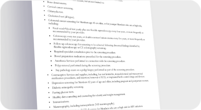 Preventive care and screenings for infants, children, and adolescents supported by the Health Resources and Services Administration (HRSA). Preventive care and screenings for women supported by HRSA. You can access the list of women’s preventive care Services at www.hrsa.gov/womensguidelines/. Services received for a current or ongoing illness, injury, sign or symptom of a disease, or condition during a preventive care examination or procedure may be subject to the applicable Cost Share. Covered preventive care Services include, but are not limited to: Bone densitometry. Cervical cancer screening. Chlamydia test. Cholesterol test (all types). Colorectal cancer screening for Members age 45 or older, or for younger Members who are at high risk, including: • Fecal occult blood test yearly plus one flexible sigmoidoscopy every four years, or more frequently as recommended by your provider. • Colonoscopy every ten years, or double contrast barium enema every five years, or more frequently as recommended by your provider. • Follow-up colonoscopy for screening to be achieved following abnormal findings identified by flexible sigmoidoscopy or CT colonography screening. • Required specialist consultation prior to the screening procedure. • Bowel preparation medications prescribed for the screening procedure. • Anesthesia Services performed in connection with the screening procedure. • Polyp removal performed during the screening procedure. • Any pathology exam on a polyp biopsy performed as part of the screening procedure. Contraceptive Services and supplies, including, but not limited to, transabdominal and transcervical sterilization procedures, and insertion/removal of IUD, or implanted birth control drugs and devices. Depression screening for Members 12 years of age and older, including pregnant and postpartum women. Diabetic retinopathy screening. Fasting glucose tests. Healthy diet counseling and counseling for obesity and weight management. Immunizations. Mammography, including tomosynthesis (3-D mammography). Pre-exposure prophylaxis (PrEP) therapies for Members who are at high risk for HIV infection. Prostate screening examinations once every two years for men 50 years of age or older or for younger Members who are at high risk, and more frequently if your provider recommends it because you are at high risk for prostate cancer or disease. Routine preventive physical exam (adult, well-baby, and well-child). Screening for physical, mental, sexual, and reproductive health care needs that arise from a sexual assault. Screening Prostate-Specific Antigen (PSA) tests (not including monitoring or ultrasensitive tests). EWCLGHDHP1983ACT0124 65 WAPEBB-CD-ACT