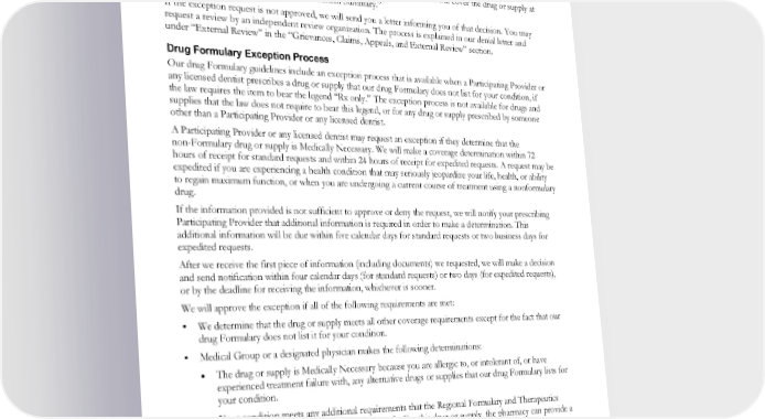 additional information will be due within five calendar days for standard requests or two business days for expedited requests. After we receive the first piece of information (including documents) we requested, we will make a decision and send notification within four calendar days (for standard requests) or two days (for expedited requests), or by the deadline for receiving the information, whichever is sooner. If the exception request is approved through this exception process, then we will cover the drug or supply at the applicable Cost Share shown in the “Benefit Summary.” If the exception request is not approved, we will send you a letter informing you of that decision. You may request a review by an independent review organization. The process is explained in our denial letter and under “External Review” in the “Grievances, Claims, Appeals, and External Review” section. Drug Formulary Exception Process Our drug Formulary guidelines include an exception process that is available when a Participating Provider or any licensed dentist prescribes a drug or supply that our drug Formulary does not list for your condition, if the law requires the item to bear the legend “Rx only.” The exception process is not available for drugs and supplies that the law does not require to bear this legend, or for any drug or supply prescribed by someone other than a Participating Provider or any licensed dentist. A Participating Provider or any licensed dentist may request an exception if they determine that the non-Formulary drug or supply is Medically Necessary. We will make a coverage determination within 72 hours of receipt for standard requests and within 24 hours of receipt for expedited requests. A request may be expedited if you are experiencing a health condition that may seriously jeopardize your life, health, or ability to regain maximum function, or when you are undergoing a current course of treatment using a nonformulary drug. If the information provided is not sufficient to approve or deny the request, we will notify your prescribing Participating Provider that additional information is required in order to make a determination. This additional information will be due within five calendar days for standard requests or two business days for expedited requests. After we receive the first piece of information (including documents) we requested, we will make a decision and send notification within four calendar days (for standard requests) or two days (for expedited requests), or by the deadline for receiving the information, whichever is sooner. We will approve the exception if all of the following requirements are met: We determine that the drug or supply meets all other coverage requirements except for the fact that our drug Formulary does not list it for your condition. Medical Group or a designated physician makes the following determinations: • The drug or supply is Medically Necessary because you are allergic to, or intolerant of, or have experienced treatment failure with, any alternative drugs or supplies that our drug Formulary lists for your condition. • Your condition meets any additional requirements that the Regional Formulary and Therapeutics Committee has approved for the drug or supply. For this drug or supply, the pharmacy can provide a copy of the additional criteria upon request. In some cases, there may be a short delay in filling your prescription while your information is being reviewed. If we approve an exception through this exception process, then we will cover the drug or supply at the applicable Cost Share shown in the “Prescription drugs, insulin, and diabetic supplies” section in the Benefit Summary. EWCLGHDHP1983ACT0124 62 WAPEBB-CD-ACT