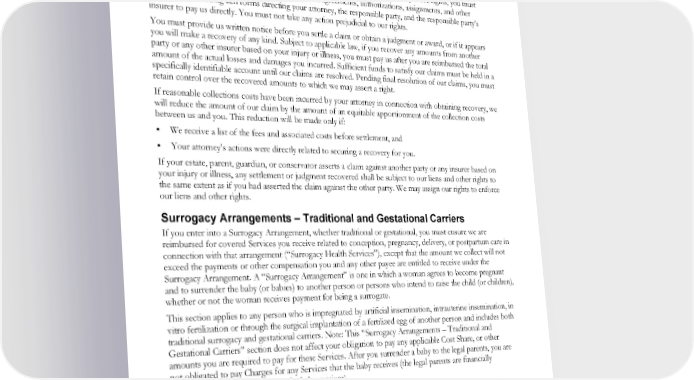 Equian, LLC Attn: Subrogation Operations P.O. Box 36380 Louisville, KY 40233 Fax: 502-214-1291 In order for us to determine the existence of any rights we may have and to satisfy those rights, you must complete and send to us all consents, releases, trust agreements, authorizations, assignments, and other documents, including lien forms directing your attorney, the responsible party, and the responsible party’s insurer to pay us directly. You must not take any action prejudicial to our rights. You must provide us written notice before you settle a claim or obtain a judgment or award, or if it appears you will make a recovery of any kind. Subject to applicable law, if you recover any amounts from another party or any other insurer based on your injury or illness, you must pay us after you are reimbursed the total amount of the actual losses and damages you incurred. Sufficient funds to satisfy our claims must be held in a specifically identifiable account until our claims are resolved. Pending final resolution of our claims, you must retain control over the recovered amounts to which we may assert a right. If reasonable collections costs have been incurred by your attorney in connection with obtaining recovery, we will reduce the amount of our claim by the amount of an equitable apportionment of the collection costs between us and you. This reduction will be made only if: We receive a list of the fees and associated costs before settlement, and Your attorney’s actions were directly related to securing a recovery for you. If your estate, parent, guardian, or conservator asserts a claim against another party or any insurer based on your injury or illness, any settlement or judgment recovered shall be subject to our liens and other rights to the same extent as if you had asserted the claim against the other party. We may assign our rights to enforce our liens and other rights. Surrogacy Arrangements – Traditional and Gestational Carriers If you enter into a Surrogacy Arrangement, whether traditional or gestational, you must ensure we are reimbursed for covered Services you receive related to conception, pregnancy, delivery, or postpartum care in connection with that arrangement (“Surrogacy Health Services”), except that the amount we collect will not exceed the payments or other compensation you and any other payee are entitled to receive under the Surrogacy Arrangement. A “Surrogacy Arrangement” is one in which a woman agrees to become pregnant and to surrender the baby (or babies) to another person or persons who intend to raise the child (or children), whether or not the woman receives payment for being a surrogate. This section applies to any person who is impregnated by artificial insemination, intrauterine insemination, in vitro fertilization or through the surgical implantation of a fertilized egg of another person and includes both traditional surrogacy and gestational carriers. Note: This “Surrogacy Arrangements – Traditional and Gestational Carriers” section does not affect your obligation to pay any applicable Cost Share, or other amounts you are required to pay for these Services. After you surrender a baby to the legal parents, you are not obligated to pay Charges for any Services that the baby receives (the legal parents are financially responsible for any Services that the baby receives). By accepting Surrogacy Health Services, you automatically assign to us your right to receive payments that are payable to you or any other payee under the Surrogacy Arrangement, regardless of whether those payments are characterized as being for medical expenses. To secure our rights, we will also have a lien on those payments and on any escrow account, trust, or any other account that holds those payments. Those payments (and amounts in any escrow account, trust, or other account that holds those payments) shall first be applied to satisfy our lien. The assignment and our lien will not exceed the total amount of your obligation to us under the preceding paragraph. EWCLGHDHP1983ACT0124 82 WAPEBB-CD-ACT
