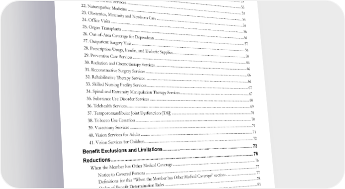 15. Hospice Services .................................................................................................................................................. 48 16. Hospital Services .................................................................................................................................................. 49 17. Interrupted Pregnancy Surgery .......................................................................................................................... 51 18. Kaiser Permanente at Home™ .......................................................................................................................... 51 19. Massage Therapy .................................................................................................................................................. 53 20. Medical Foods and Formula .............................................................................................................................. 53 21. Mental Health Services ........................................................................................................................................ 53 22. Naturopathic Medicine ....................................................................................................................................... 54 23. Obstetrics, Maternity and Newborn Care ........................................................................................................ 55 24. Office Visits .......................................................................................................................................................... 56 25. Organ Transplants ............................................................................................................................................... 56 26. Out-of-Area Coverage for Dependents............................................................................................................ 57 27. Outpatient Surgery Visit ..................................................................................................................................... 58 28. Prescription Drugs, Insulin, and Diabetic Supplies ........................................................................................ 58 29. Preventive Care Services ..................................................................................................................................... 64 30. Radiation and Chemotherapy Services ............................................................................................................. 66 31. Reconstructive Surgery Services ........................................................................................................................ 66 32. Rehabilitative Therapy Services ......................................................................................................................... 66 33. Skilled Nursing Facility Services ........................................................................................................................ 67 34. Spinal and Extremity Manipulation Therapy Services .................................................................................... 67 35. Substance Use Disorder Services ...................................................................................................................... 68 36. Telehealth Services............................................................................................................................................... 69 37. Temporomandibular Joint Dysfunction (TMJ) ............................................................................................... 70 38. Tobacco Use Cessation ....................................................................................................................................... 70 39. Vasectomy Services ............................................................................................................................................. 71 40. Vision Services for Adults .................................................................................................................................. 71 41. Vision Services for Children ............................................................................................................................... 72 Benefit Exclusions and Limitations .............................................................................. 73 Reductions ...................................................................................................................... 76 When the Member has Other Medical Coverage .................................................................................................. 76 Notice to Covered Persons ................................................................................................................................ 77 Definitions for this “When the Member has Other Medical Coverage” section: ...................................... 77 Order of Benefit Determination Rules ............................................................................................................ 78 Hospitalization on Your Effective Date ................................................................................................................. 81 When Another Party is Responsible for Injury or Illness (Subrogation) ........................................................... 81 Injuries or Illnesses Alleged to be Caused by Other Parties or Covered by No-fault Insurance ............ 81 Surrogacy Arrangements – Traditional and Gestational Carriers ....................................................................... 82 Workers’ Compensation or Employer’s Liability .................................................................................................. 83 Grievances, Claims, Appeals, and External Review ................................................... 83 EWCLGHDHP01983ACT012