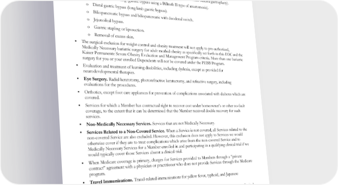 exercise programs (formal or informal) and exercise equipment. Travel expenses associated with non-surgical or surgical weight control or obesity services are not covered. • Surgical: Surgery for dietary or weight control, and any direct or non-direct complications arising from such non-covered surgeries, whether prescribed or recommended by a physician, including surgeries such as: o Gastric banding (including adjustable gastric/lap banding and vertical banded gastroplasty). o Mini-gastric banding (gastric bypass using a Billroth II type of anastomosis). o Distal gastric bypass (long limb gastric bypass). o Biliopancreatic bypass and biliopancreatic with duodenal switch. o Jejunoileal bypass. o Gastric stapling or liposuction. o Removal of excess skin. The surgical exclusion for weight control and obesity treatment will not apply to pre-authorized, Medically Necessary bariatric surgery for adult morbid obesity as specifically set forth in this EOC and the Kaiser Permanente Severe Obesity Evaluation and Management Program criteria. More than one bariatric surgery for you or your enrolled Dependents will not be covered under the PEBB Program. Evaluation and treatment of learning disabilities, including dyslexia, except as provided for neurodevelopmental therapies. Eye Surgery. Radial keratotomy, photorefractive keratectomy, and refractive surgery, including evaluations for the procedures. Orthotics, except foot care appliances for prevention of complications associated with diabetes which are covered. Services for which a Member has contractual right to recover cost under homeowner’s or other no-fault coverage, to the extent that it can be determined that the Member received double recovery for such services. Non-Medically Necessary Services. Services that are not Medically Necessary. Services Related to a Non-Covered Service. When a Service is not covered, all Services related to the non-covered Service are also excluded. However, this exclusion does not apply to Services we would otherwise cover if they are to treat complications which arise from the non-covered Service and to Medically Necessary Services for a Member enrolled in and participating in a qualifying clinical trial if we would typically cover those Services absent a clinical trial. When Medicare coverage is primary, charges for Services provided to Members through a “private contract” agreement with a physician or practitioner who does not provide Services through the Medicare program. Travel Immunizations. Travel-related immunizations for yellow fever, typhoid, and Japanese encephalitis. Travel and Lodging. Transportation or living expenses for any person, including the patient, are limited to travel and lodging expenses needed for the Member to receive covered Services at Non-Participating Facilities, subject to Utilization Review by Kaiser using criteria developed by Medical Group and approved by Kaiser. Services That are Not Health Care Services, Supplies, or Items. This exclusion does not apply to Medically Necessary applied behavior analysis (ABA) Services. For example, we do not cover: EWCLGHDHP1983ACT0124 75 WAPEBB-CD-ACT