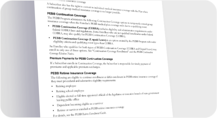 Options for Continuing PEBB Medical Coverage When medical coverage ends, the Subscriber and their Dependents covered by this medical plan may be eligible to continue PEBB medical coverage during temporary or permanent loss of eligibility. There are three options the Subscriber and their Dependents may qualify for when coverage ends. PEBB Continuation Coverage (COBRA) PEBB Continuation Coverage (Unpaid Leave) PEBB retiree insurance coverage A Subscriber also has the right to convert to individual medical insurance coverage with the Plan when continuation of group medical insurance coverage is no longer possible. PEBB Continuation Coverage The PEBB Program administers the following Continuation Coverage options to temporarily extend group insurance coverage when the Enrollee’s PEBB medical plan coverage ends due to a qualifying event: PEBB Continuation Coverage (COBRA) includes eligibility and administrative requirements under federal COBRA laws and regulations. Some Enrollees who are not qualified beneficiaries under federal COBRA, may also qualify for PEBB Continuation Coverage (COBRA). PEBB Continuation Coverage (Unpaid Leave) is an option created by the PEBB Program with wider eligibility criteria and qualifying event types than COBRA. An Enrollee who qualifies for both types of PEBB Continuation Coverage (COBRA and Unpaid Leave) may enroll in only one of these options. See “Continuation Coverage Enrollment” and the PEBB Continuation Coverage Election Notice. Premium Payments for PEBB Continuation Coverage If a Subscriber enrolls in Continuation Coverage, the Subscriber is responsible for timely payment of premiums and applicable premium surcharges. PEBB Retiree Insurance Coverage The following are eligible to continue enrollment or defer enrollment in PEBB retiree insurance coverage if they meet procedural and substantive eligibility requirements: Retiring employee Retiring school employee Eligible elected or full-time appointed official of the legislative or executive branch of state government leaving public office Dependent becoming eligible as a survivor Retiree or survivor enrolled in PEBB retiree insurance coverage For details, see the PEBB Retiree Enrollment Guide. Family and Medical Leave Act of 1993 An employee on approved leave under the federal Family and Medical Leave Act (FMLA) may continue to receive the employer contribution toward PEBB benefits in accordance with the federal FMLA. The Employing Agency determines if the employee is eligible for leave and the duration of the leave under FMLA. The employee must continue to pay their monthly premium contribution and applicable premium surcharges during this period to maintain eligibility. EWCLGHDHP1983ACT0124 28 WAPEBB-CD-ACT