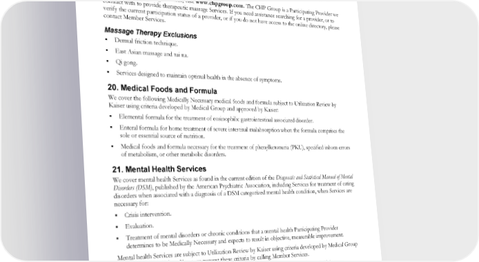 19. Massage Therapy We cover outpatient visits for therapeutic massage Services without prior authorization, when the Services are received from a Participating Provider and provided as outpatient Services in the provider’s office, up to the visit limit shown on your “Benefit Summary.” Therapeutic massage involves the manipulation of soft tissue structures of the body to help alleviate pain, muscle discomfort, and stress by helping to promote health and wellness. To locate a Participating Provider, visit www.chpgroup.com. The CHP Group is a Participating Provider we contract with to provide therapeutic massage Services. If you need assistance searching for a provider, or to verify the current participation status of a provider, or if you do not have access to the online directory, please contact Member Services. Massage Therapy Exclusions Dermal friction technique. East Asian massage and tui na. Qi gong. Services designed to maintain optimal health in the absence of symptoms. 20. Medical Foods and Formula We cover the following Medically Necessary medical foods and formula subject to Utilization Review by Kaiser using criteria developed by Medical Group and approved by Kaiser: Elemental formula for the treatment of eosinophilic gastrointestinal associated disorder. Enteral formula for home treatment of severe intestinal malabsorption when the formula comprises the sole or essential source of nutrition. Medical foods and formula necessary for the treatment of phenylketonuria (PKU), specified inborn errors of metabolism, or other metabolic disorders. 21. Mental Health Services We cover mental health Services as found in the current edition of the Diagnostic and Statistical Manual of Mental Disorders (DSM), published by the American Psychiatric Association, including Services for treatment of eating disorders when associated with a diagnosis of a DSM categorized mental health condition, when Services are necessary for: Crisis intervention. Evaluation. Treatment of mental disorders or chronic conditions that a mental health Participating Provider determines to be Medically Necessary and expects to result in objective, measurable improvement. Mental health Services are subject to Utilization Review by Kaiser using criteria developed by Medical Group and approved by Kaiser. You may request these criteria by calling Member Services. We cover Participating Provider Services under this “Mental Health Services” section only if they are provided by a licensed psychiatrist, licensed psychologist, licensed clinical social worker, licensed mental health counselor, licensed professional counselor, licensed marriage and family therapist, advanced practice psychiatric nurse, licensed behavioral analyst, licensed assistant behavioral analyst or registered behavioral analyst interventionist. The benefits described in this “Mental Health Services” section comply with the Mental Health Parity and Addiction Equity Act. EWCLGHDHP1983ACT0124 53 WAPEBB-CD-ACT