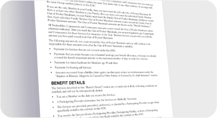 Copayments and Coinsurance The Copayment or Coinsurance for each covered Service is shown in the “Benefit Summary.” Copayments or Coinsurance are due when you receive the Service. You are not responsible for paying any amount over the Allowed Amount for Services received from a Non-Participating Provider at a Participating Facility. Out-of-Pocket Maximum There is a maximum to the total dollar amount of Deductible, Copayment and Coinsurance that you must pay for covered Services that you receive within the same Year under this or any other evidence of coverage with the same Group number printed on this EOC. If you are the only Member in your Family, then you must meet the self-only Out-of-Pocket Maximum. If there is at least one other Member in your Family, then you must each meet the individual Family Member Out-of-Pocket Maximum, or your Family must meet the Family Out-of-Pocket Maximum, whichever occurs first. Each individual Family Member Out-of-Pocket Maximum amount counts toward the Family Out-of- Pocket Maximum amount. The Out-of-Pocket Maximum amounts are shown in the “Benefit Summary.” All Deductibles, Copayments and Coinsurance amounts count toward the Out-of-Pocket Maximum unless otherwise indicated. After you reach the Out-of-Pocket Maximum, you are not required to pay Copayments and Coinsurance for these Services for remainder of the Year. Member Services can provide you with the amount you have paid toward your Out-of-Pocket Maximum. The following amounts do not count toward the Out-of-Pocket Maximum and you will continue to be responsible for these amounts even after the Out-of-Pocket Maximum is satisfied: Payments for Services that are not covered under this EOC. Payments that you make because you exhausted (used up) your benefit allowance, or because we already covered the benefit maximum amount or the maximum number of days or visits for a Service. Payments for vision hardware for Members age 19 and older. Payments for hearing aid Services. Amounts recovered from a liability claim against another party subject to reimbursement under the “Injuries or Illnesses Alleged to be Caused by Other Parties or Covered by No-fault Insurance” section. BENEFIT DETAILS The Services described in this “Benefit Details” section are covered only if all the following conditions are satisfied, and will not be retrospectively denied: You are a Member on the date you receive the Services. A Participating Provider determines that the Services are Medically Necessary. The Services are provided, prescribed, authorized, or directed by a Participating Provider except where specifically noted to the contrary in this EOC. You receive the Services from a Participating Provider, Participating Facility, or from a Participating Skilled Nursing Facility, except where specifically noted to the contrary in this EOC. You receive prior authorization for the Services, if required under “Prior and Concurrent Authorization and Utilization Review” in the “How to Obtain Services” section. All Services are subject to the coverage requirements described in this “Benefit Details” section. Some Services are subject to benefit-specific exclusions and/or limitations and eligibility provisions, which are listed, when applicable, in each benefit section. A broader list of exclusions and limitations that apply to all benefits is provided under the “Benefit Exclusions and Limitations” section. EWCLGHDHP1983ACT0124 39 WAPEBB-CD-ACT