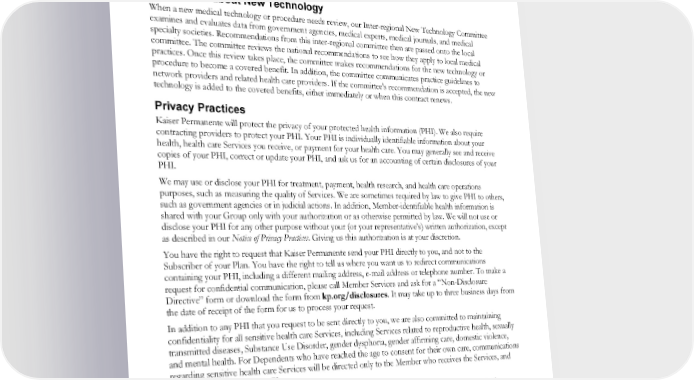 MISCELLANEOUS PROVISIONS Exercise of Conscience We recognize the right to exercise religious beliefs and conscience. If a Participating Provider or Participating Facility declines to provide a covered Service for reasons of conscience or religion, we will make arrangements to provide the covered Services. Information about New Technology When a new medical technology or procedure needs review, our Inter-regional New Technology Committee examines and evaluates data from government agencies, medical experts, medical journals, and medical specialty societies. Recommendations from this inter-regional committee then are passed onto the local committee. The committee reviews the national recommendations to see how they apply to local medical practices. Once this review takes place, the committee makes recommendations for the new technology or procedure to become a covered benefit. In addition, the committee communicates practice guidelines to network providers and related health care providers. If the committee's recommendation is accepted, the new technology is added to the covered benefits, either immediately or when this contract renews. Privacy Practices Kaiser Permanente will protect the privacy of your protected health information (PHI). We also require contracting providers to protect your PHI. Your PHI is individually identifiable information about your health, health care Services you receive, or payment for your health care. You may generally see and receive copies of your PHI, correct or update your PHI, and ask us for an accounting of certain disclosures of your PHI. We may use or disclose your PHI for treatment, payment, health research, and health care operations purposes, such as measuring the quality of Services. We are sometimes required by law to give PHI to others, such as government agencies or in judicial actions. In addition, Member-identifiable health information is shared with your Group only with your authorization or as otherwise permitted by law. We will not use or disclose your PHI for any other purpose without your (or your representative’s) written authorization, except as described in our Notice of Privacy Practices. Giving us this authorization is at your discretion. You have the right to request that Kaiser Permanente send your PHI directly to you, and not to the Subscriber of your Plan. You have the right to tell us where you want us to redirect communications containing your PHI, including a different mailing address, e-mail address or telephone number. To make a request for confidential communication, please call Member Services and ask for a “Non-Disclosure Directive” form or download the form from kp.org/disclosures. It may take up to three business days from the date of receipt of the form for us to process your request. In addition to any PHI that you request to be sent directly to you, we are also committed to maintaining confidentiality for all sensitive health care Services, including Services related to reproductive health, sexually transmitted diseases, Substance Use Disorder, gender dysphoria, gender affirming care, domestic violence, and mental health. For Dependents who have reached the age to consent for their own care, communications regarding sensitive health care Services will be directed only to the Member who receives the Services, and not to the Subscriber of the Plan. This is only a brief summary of some of our key privacy practices. Our Notice of Privacy Practices, which provides additional information about our privacy practices and your rights regarding your PHI, is available and will be furnished to you upon request. To request a copy, please call Member Services. You can also find the notice at your local Participating Facility or on our website at kp.org. EWCLGHDHP1983ACT0124 94 WAPEBB-CD-ACT