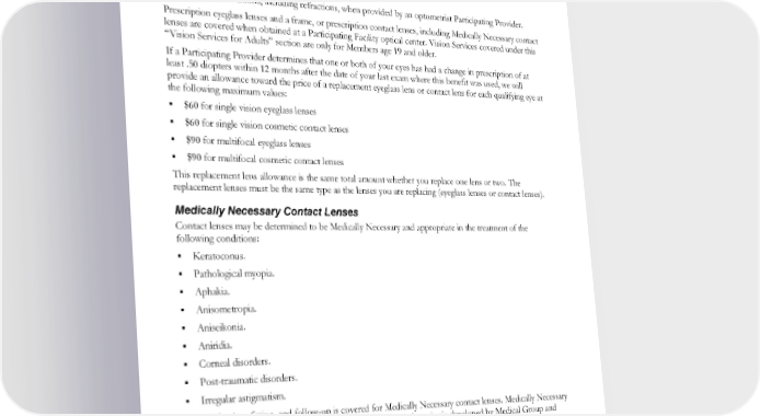 the free phone-based program, “Talk with a Health Consultant,” call 503-286-6816 or 1-866-301-3866 (toll free) and select option 2. 39. Vasectomy Services Male sterilization procedures such as vasectomy are covered. 40. Vision Services for Adults Routine eye examinations, including refractions, when provided by an optometrist Participating Provider. Prescription eyeglass lenses and a frame, or prescription contact lenses, including Medically Necessary contact lenses are covered when obtained at a Participating Facility optical center. Vision Services covered under this “Vision Services for Adults” section are only for Members age 19 and older. If a Participating Provider determines that one or both of your eyes has had a change in prescription of at least .50 diopters within 12 months after the date of your last exam where this benefit was used, we will provide an allowance toward the price of a replacement eyeglass lens or contact lens for each qualifying eye at the following maximum values: $60 for single vision eyeglass lenses $60 for single vision cosmetic contact lenses $90 for multifocal eyeglass lenses $90 for multifocal cosmetic contact lenses This replacement lens allowance is the same total amount whether you replace one lens or two. The replacement lenses must be the same type as the lenses you are replacing (eyeglass lenses or contact lenses). Medically Necessary Contact Lenses Contact lenses may be determined to be Medically Necessary and appropriate in the treatment of the following conditions: Keratoconus. Pathological myopia. Aphakia. Anisometropia. Aniseikonia. Aniridia. Corneal disorders. Post-traumatic disorders. Irregular astigmatism. The evaluation, fitting, and follow-up is covered for Medically Necessary contact lenses. Medically Necessary contact lenses are subject to Utilization Review by Kaiser using criteria developed by Medical Group and approved by Kaiser. Eyeglasses and Contact Lenses after Cataract Surgery If you have cataract surgery and since that surgery we have never covered eyeglasses or contact lenses under any benefit for eyeglasses and contact lenses after cataract surgery (including any eyeglasses or contact lenses we covered under any other coverage), we cover your choice of one of the following without charge, if EWCLGHDHP1983ACT0124 71 WAPEBB-CD-ACT