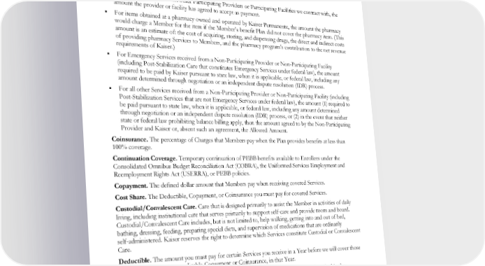 Charges. Charges means the following: For Services provided by Medical Group and Kaiser Foundation Hospitals, the amount in Kaiser’s schedule of Medical Group and Kaiser Foundation Hospitals charges for Services provided to Members. For Services for which a provider or facility (other than Medical Group or Kaiser Foundation Hospitals) is compensated on a capitation basis, the amount in the schedule of charges that Kaiser negotiates with the capitated provider. For Services received from other Participating Providers or Participating Facilities we contract with, the amount the provider or facility has agreed to accept as payment. For items obtained at a pharmacy owned and operated by Kaiser Permanente, the amount the pharmacy would charge a Member for the item if the Member’s benefit Plan did not cover the pharmacy item. (This amount is an estimate of: the cost of acquiring, storing, and dispensing drugs, the direct and indirect costs of providing pharmacy Services to Members, and the pharmacy program’s contribution to the net revenue requirements of Kaiser.) For Emergency Services received from a Non-Participating Provider or Non-Participating Facility (including Post-Stabilization Care that constitutes Emergency Services under federal law), the amount required to be paid by Kaiser pursuant to state law, when it is applicable, or federal law, including any amount determined through negotiation or an independent dispute resolution (IDR) process. For all other Services received from a Non-Participating Provider or Non-Participating Facility (including Post-Stabilization Services that are not Emergency Services under federal law), the amount (1) required to be paid pursuant to state law, when it is applicable, or federal law, including any amount determined through negotiation or an independent dispute resolution (IDR) process, or (2) in the event that neither state or federal law prohibiting balance billing apply, then the amount agreed to by the Non-Participating Provider and Kaiser or, absent such an agreement, the Allowed Amount. Coinsurance. The percentage of Charges that Members pay when the Plan provides benefits at less than 100% coverage. Continuation Coverage. Temporary continuation of PEBB benefits available to Enrollees under the Consolidated Omnibus Budget Reconciliation Act (COBRA), the Uniformed Services Employment and Reemployment Rights Act (USERRA), or PEBB policies. Copayment. The defined dollar amount that Members pay when receiving covered Services. Cost Share. The Deductible, Copayment, or Coinsurance you must pay for covered Services. Custodial/Convalescent Care. Care that is designed primarily to assist the Member in activities of daily living, including institutional care that serves primarily to support self-care and provide room and board. Custodial/Convalescent Care includes, but is not limited to, help walking, getting into and out of bed, bathing, dressing, feeding, preparing special diets, and supervision of medications that are ordinarily self-administered. Kaiser reserves the right to determine which Services constitute Custodial or Convalescent Care. Deductible. The amount you must pay for certain Services you receive in a Year before we will cover those Services, subject to any applicable Copayment or Coinsurance, in that Year. Dependent. A Member who meets the eligibility requirements for a Dependent as described in the “Dependent Eligibility” section of this EOC. Durable Medical Equipment (DME). Non-disposable supply or item of equipment that is able to withstand repeated use, primarily and customarily used to serve a medical purpose and generally not useful to the Member if the Member is not ill or injured. EWCLGHDHP1983ACT0124 9 WAPEBB-CD-ACT