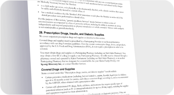 “Receiving Care in Another Kaiser Foundation Health Plan Service Area.” 27. Outpatient Surgery Visit Services at an ambulatory surgical center (discharged within 24 hours of admission) are covered. Services must be provided at a Participating Facility and are subject to Utilization Review by Kaiser using criteria developed by Medical Group and approved by Kaiser. General anesthesia Services and related facility charges in conjunction with any non-covered dental procedure performed in an ambulatory surgical center are covered if such anesthesia Services and related facility charges are Medically Necessary because the Member: is a child under age seven, or is physically or developmentally disabled, with a dental condition that cannot be safely and effectively treated in a dental office; or has a medical condition that the Member’s PCP determines would place the Member at undue risk if the dental procedure were performed in a dental office. For the purpose of this section, “general anesthesia Services” means Services to induce a state of unconsciousness accompanied by a loss of protective reflexes, including the ability to maintain an airway independently and respond purposefully to physical stimulation or verbal command. Nitrous oxide analgesia is not reimbursable as general anesthesia. 28. Prescription Drugs, Insulin, and Diabetic Supplies We cover outpatient prescription drugs and supplies as described in this section. Covered drugs and supplies must be prescribed by a Participating Provider or any licensed dentist in accordance with our drug Formulary guidelines. Over-the-counter contraceptive drugs, device, and products, approved by the U.S. Food and Drug Administration (FDA), do not require a prescription in order to be covered. You must obtain drugs and supplies at a Participating Pharmacy (including our Mail-Order Pharmacy). You may obtain a first fill of a drug or supply at any Participating Pharmacy. All refills must be obtained through a pharmacy owned and operated by Kaiser Permanente (including our Mail-Order Pharmacy), or at another Participating Pharmacy that we designate for covered refills. See your Medical Facility Directory, visit kp.org/directory/nw, or contact Member Services. Covered Drugs and Supplies Items covered under this “Prescription drugs, insulin, and diabetic supplies” benefit include: Certain preventive medications (including, but not limited to, aspirin, fluoride, liquid iron for children ages 6 to 12 months at risk for anemia, and tobacco cessation drugs) according to, and as recommended by, the USPSTF, when obtained with a prescription order. Certain self-administered IV drugs, fluids, additives, and nutrients that require specific types of parenteral-infusion (such as IV or intraspinal-infusion) for up to a 30-day supply, including the supplies and equipment required for their administration. Drugs, injectables, and radioactive materials used for therapeutic or diagnostic purposes, if they are administered to you in a Participating Medical Office or during home visits. We cover these items upon payment of the Administered Medications Cost Share shown in the “Benefit Summary.” Drugs prescribed for an indication if the FDA has not approved the drug for that indication (off-label drugs) are covered only if our Regional Formulary and Therapeutics Committee determines that the drug is recognized as effective for that use (i) in one of the standard reference compendia, or (ii) in the majority of relevant peer-reviewed medical literature, or (iii) by the Secretary of the U.S. Department of Health and Human Services. EWCLGHDHP1983ACT0124 58 WAPEBB-CD-ACT
