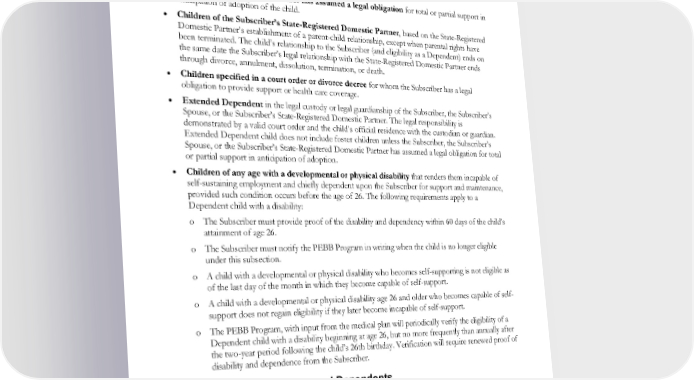 • Children based on establishment of a parent-child relationship, as described in Washington State statutes, except when parental rights have been terminated. • Children of the Subscriber’s Spouse, based on the Spouse’s establishment of a parent-child relationship, except when parental rights have been terminated. The stepchild’s relationship to the Subscriber (and eligibility as a Dependent) ends on the same date the marriage with the Spouse ends through divorce, annulment, dissolution, termination, or death. • Children for whom the Subscriber has assumed a legal obligation for total or partial support in anticipation of adoption of the child. • Children of the Subscriber’s State-Registered Domestic Partner, based on the State-Registered Domestic Partner’s establishment of a parent-child relationship, except when parental rights have been terminated. The child’s relationship to the Subscriber (and eligibility as a Dependent) ends on the same date the Subscriber’s legal relationship with the State-Registered Domestic Partner ends through divorce, annulment, dissolution, termination, or death. • Children specified in a court order or divorce decree for whom the Subscriber has a legal obligation to provide support or health care coverage. • Extended Dependent in the legal custody or legal guardianship of the Subscriber, the Subscriber’s Spouse, or the Subscriber’s State-Registered Domestic Partner. The legal responsibility is demonstrated by a valid court order and the child’s official residence with the custodian or guardian. Extended Dependent child does not include foster children unless the Subscriber, the Subscriber’s Spouse, or the Subscriber’s State-Registered Domestic Partner has assumed a legal obligation for total or partial support in anticipation of adoption. • Children of any age with a developmental or physical disability that renders them incapable of self-sustaining employment and chiefly dependent upon the Subscriber for support and maintenance, provided such condition occurs before the age of 26. The following requirements apply to a Dependent child with a disability: o The Subscriber must provide proof of the disability and dependency within 60 days of the child’s attainment of age 26. o The Subscriber must notify the PEBB Program in writing when the child is no longer eligible under this subsection. o A child with a developmental or physical disability who becomes self-supporting is not eligible as of the last day of the month in which they become capable of self-support. o A child with a developmental or physical disability age 26 and older who becomes capable of self- support does not regain eligibility if they later become incapable of self-support. o The PEBB Program, with input from the medical plan will periodically verify the eligibility of a Dependent child with a disability beginning at age 26, but no more frequently than annually after the two-year period following the child’s 26th birthday. Verification will require renewed proof of disability and dependence from the Subscriber. Enrollment for Subscribers and Dependents For All Subscribers and Dependents To enroll at any time other than during the initial enrollment period, see “Making Changes.” Any Dependents enrolled in medical coverage will be enrolled in the same medical Plan as the Subscriber. Exceptions apply for non-Medicare enrollees when a subscriber selects a Medicare Supplement, Medicare Advantage, or Medicare Advantage Prescription Drug plan. EWCLGHDHP1983ACT0124 16 WAPEBB-CD-ACT