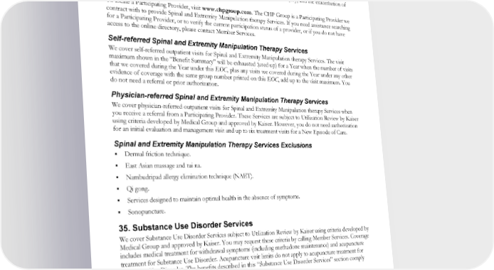 Evaluation and management. Diagnostic radiology. Musculoskeletal treatments. Hot and cold packs, Treatment for the onset of an illness or injury, aggravation of an illness or injury, and the exacerbation of an illness or injury. To locate a Participating Provider, visit www.chpgroup.com. The CHP Group is a Participating Provider we contract with to provide Spinal and Extremity Manipulation therapy Services. If you need assistance searching for a Participating Provider, or to verify the current participation status of a provider, or if you do not have access to the online directory, please contact Member Services. Self-referred Spinal and Extremity Manipulation Therapy Services We cover self-referred outpatient visits for Spinal and Extremity Manipulation therapy Services. The visit maximum shown in the “Benefit Summary” will be exhausted (used up) for a Year when the number of visits that we covered during the Year under this EOC, plus any visits we covered during the Year under any other evidence of coverage with the same group number printed on this EOC, add up to the visit maximum. You do not need a referral or prior authorization. Physician-referred Spinal and Extremity Manipulation Therapy Services We cover physician-referred outpatient visits for Spinal and Extremity Manipulation therapy Services when you receive a referral from a Participating Provider. These Services are subject to Utilization Review by Kaiser using criteria developed by Medical Group and approved by Kaiser. However, you do not need authorization for an initial evaluation and management visit and up to six treatment visits for a New Episode of Care. Spinal and Extremity Manipulation Therapy Services Exclusions Dermal friction technique. East Asian massage and tui na. Nambudripad allergy elimination technique (NAET). Qi gong. Services designed to maintain optimal health in the absence of symptoms. Sonopuncture. 35. Substance Use Disorder Services We cover Substance Use Disorder Services subject to Utilization Review by Kaiser using criteria developed by Medical Group and approved by Kaiser. You may request these criteria by calling Member Services. Coverage includes medical treatment for withdrawal symptoms (including methadone maintenance) and acupuncture treatment for Substance Use Disorder. Acupuncture visit limits do not apply to acupuncture treatment for Substance Use Disorder. The benefits described in this “Substance Use Disorder Services” section comply with the Mental Health Parity and Addiction Equity Act. You do not need to obtain prior authorization for the following Substance Use Disorder Services: Emergency detoxification for medical conditions associated with acute alcohol, drug, or other substance abuse. Substance Use Disorder treatment Services provided in a behavioral health agency licensed or certified in the state of Washington, limited to: EWCLGHDHP1983ACT0124 68 WAPEBB-CD-ACT