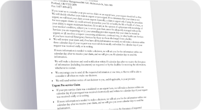Non-urgent Pre-Service Claim • You may request a pre-service benefit determination on your own behalf. Tell us in writing or orally that you want to make a claim for us to provide or pay for a Service you have not yet received. Your request and any related documents you give us constitute your claim. You may email your request to us at https://healthy.kaiserpermanente.org/oregon-washington/support, call us, or mail your claim to us at: Kaiser Foundation Health Plan of the Northwest Attn: Utilization Management500 N.E. Multnomah St., Suite 100 Portland, OR 97232-2099 Fax: 1-877-899-4972 If you want us to consider your pre-service claim on an urgent basis, your request should tell us that. We will decide whether your claim is urgent or non-urgent. If we determine that your claim is not urgent, we will treat your claim as non-urgent. Generally, a claim is urgent only if using the procedure for non-urgent claims (a) could seriously jeopardize your life or health, the life or health of a fetus, or your ability to regain maximum function; (b) would, in the opinion of a physician with knowledge of your medical condition, subject you to severe pain that cannot be adequately managed without the Services you are requesting; or (c) your attending provider requests that your claim be treated as urgent; or (d) involves a request concerning admissions, continued stay, or other health care Services if you have received Emergency Services but have not been discharged from a facility. • We will review your claim and, if we have all the information we need, we will make a decision within three calendar days if your request was received electronically and within five calendar days if your request was received orally or in writing. If more information is needed to make a decision, we will ask you for the information within one calendar day after we receive your claim, and we will give you 45 calendar days to send the information. We will make a decision and send notification within 15 calendar days after we receive the first piece of information (including documents) we requested or by the deadline for receiving the information, whichever is sooner. • We encourage you to send all the requested information at one time, so that we will be able to consider it all when we make our decision. • We will send written notice of our decision to you, and if applicable, to your provider. Urgent Pre-service Claim • If your pre-service claim was considered on an urgent basis, we will make a decision within one calendar day if your request was received electronically and within two calendar days if your request was received orally or in writing. • If more information is needed to make a decision, we will ask you for the information within one calendar day after we receive your claim, and we will give you seven calendar days to send the information. We will notify you of our decision within 48 hours of receiving the first piece of requested information or by the deadline for receiving the information, whichever is sooner. If we notify you of our decision orally, we will send you, and, if applicable, your provider, written confirmation within three calendar days after the oral notification. • If we deny your claim (if we do not agree to provide or pay for all the Services you requested), our adverse benefit determination notice will tell you why we denied your claim and how you can appeal. EWCLGHDHP1983ACT0124 87 WAPEBB-CD-ACT