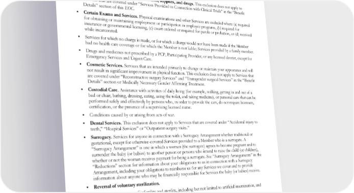 Services not provided by a Participating Provider or obtained in accordance with Kaiser’s standard referral and authorization requirements, except for Emergency Services and Urgent Care or as covered under coordination of benefits provisions. Services provided by Non-Participating Providers are not covered inside or outside of the Service Area except for: Emergency Services and Urgent Care; as specifically provided in the Out-of-Area coverage section; or when otherwise specifically provided. Experimental or investigational Services, supplies, and drugs. This exclusion does not apply to Services that are covered under “Services Provided in Connection with Clinical Trials” in the “Benefit Details” section of this EOC. Certain Exams and Services. Physical examinations and other Services are excluded when: (a) required for obtaining or maintaining employment or participation in employee programs, (b) required for insurance or governmental licensing, (c) court ordered or required for parole or probation, or (d) received while incarcerated. Services for which no charge is made, or for which a charge would not have been made if the Member had no health care coverage or for which the Member is not liable; Services provided by a family member. Drugs and medicines not prescribed by a PCP, Participating Provider, or any licensed dentist, except for Emergency Services and Urgent Care. Cosmetic Services. Services that are intended primarily to change or maintain your appearance and will not result in significant improvement in physical function. This exclusion does not apply to Services that are covered under “Reconstructive surgery Services” and “Transgender surgical Services” in the “Benefit Details” section or Medically Necessary Gender Affirming Treatment. Custodial Care. Assistance with activities of daily living (for example, walking, getting in and out of a bed or chair, bathing, dressing, eating, using the toilet, and taking medicine), or personal care that can be performed safely and effectively by persons who, in order to provide the care, do not require licensure, certification, or the presence of a supervising licensed nurse. Conditions caused by or arising from acts of war. Dental Services. This exclusion does not apply to Services that are covered under “Accidental injury to teeth,” “Hospital Services” or “Outpatient surgery visits.” Surrogacy. Services for anyone in connection with a Surrogacy Arrangement whether traditional or gestational, except for otherwise-covered Services provided to a Member who is a surrogate. A “Surrogacy Arrangement” is one in which a woman (the surrogate) agrees to become pregnant and to surrender the baby (or babies) to another person or persons who intend to raise the child (or children), whether or not the woman receives payment for being a surrogate. See “Surrogacy Arrangements” in the “Reductions” section for information about your obligations to us in connection with a Surrogacy Arrangement, including your obligations to reimburse us for any Services we cover and to provide information about anyone who may be financially responsible for Services the baby (or babies) receive. Reversal of voluntary sterilization. Testing and treatment of infertility and sterility, including but not limited to artificial insemination, and in-vitro fertilization. Services provided solely for the comfort of the Member, except palliative care provided under the “Hospice Services” benefit. Weight Control and Obesity Treatment. • Non-surgical: Any weight loss or weight control programs, treatments, services, or supplies, even when prescribed by a physician, including, but not limited to, prescription and over-the-counter drugs, EWCLGHDHP1983ACT0124 74 WAPEBB-CD-ACT