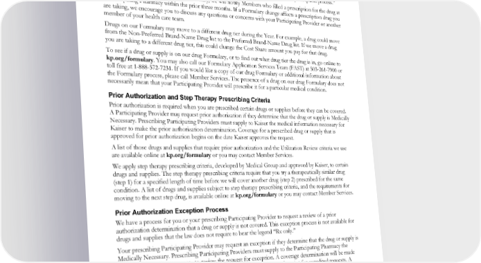 effective. They may also exclude a drug if it does not have a clinical or cost advantage over comparable Formulary drugs. The Regional Formulary and Therapeutics Committee meets to review new drugs and reconsider drugs currently on the market. After this review, they may add drugs to the Formulary or remove drugs from it. If a drug is removed from the Formulary, you will need to switch to another comparable drug that is on the drug Formulary, unless your old drug meets exception criteria. Refer to the “Drug Formulary exception process.” When a drug is removed from the Formulary, we will notify Members who filled a prescription for the drug at a Participating Pharmacy within the prior three months. If a Formulary change affects a prescription drug you are taking, we encourage you to discuss any questions or concerns with your Participating Provider or another member of your health care team. Drugs on our Formulary may move to a different drug tier during the Year. For example, a drug could move from the Non-Preferred Brand-Name Drug list to the Preferred Brand-Name Drug list. If we move a drug you are taking to a different drug tier, this could change the Cost Share amount you pay for that drug. To see if a drug or supply is on our drug Formulary, or to find out what drug tier the drug is in, go online to kp.org/formulary. You may also call our Formulary Application Services Team (FAST) at 503-261-7900 or toll free at 1-888-572-7231. If you would like a copy of our drug Formulary or additional information about the Formulary process, please call Member Services. The presence of a drug on our drug Formulary does not necessarily mean that your Participating Provider will prescribe it for a particular medical condition. Prior Authorization and Step Therapy Prescribing Criteria Prior authorization is required when you are prescribed certain drugs or supplies before they can be covered. A Participating Provider may request prior authorization if they determine that the drug or supply is Medically Necessary. Prescribing Participating Providers must supply to Kaiser the medical information necessary for Kaiser to make the prior authorization determination. Coverage for a prescribed drug or supply that is approved for prior authorization begins on the date Kaiser approves the request. A list of those drugs and supplies that require prior authorization and the Utilization Review criteria we use are available online at kp.org/formulary or you may contact Member Services. We apply step therapy prescribing criteria, developed by Medical Group and approved by Kaiser, to certain drugs and supplies. The step therapy prescribing criteria require that you try a therapeutically similar drug (step 1) for a specified length of time before we will cover another drug (step 2) prescribed for the same condition. A list of drugs and supplies subject to step therapy prescribing criteria, and the requirements for moving to the next step drug, is available online at kp.org/formulary or you may contact Member Services. Prior Authorization Exception Process We have a process for you or your prescribing Participating Provider to request a review of a prior authorization determination that a drug or supply is not covered. This exception process is not available for drugs and supplies that the law does not require to bear the legend “Rx only.” Your prescribing Participating Provider may request an exception if they determine that the drug or supply is Medically Necessary. Prescribing Participating Providers must supply to the Participating Pharmacy the medical information necessary to review the request for exception. A coverage determination will be made within 72 hours of receipt for standard requests and within 24 hours of receipt for expedited requests. A request may be expedited if you are experiencing a health condition that may seriously jeopardize your life, health, or ability to regain maximum function, or when you are undergoing a current course of treatment using a nonformulary drug. If the information provided is not sufficient to approve or deny the request, we will notify your prescribing Participating Provider that additional information is required in order to make a determination. This EWCLGHDHP1983ACT0124 61 WAPEBB-CD-ACT
